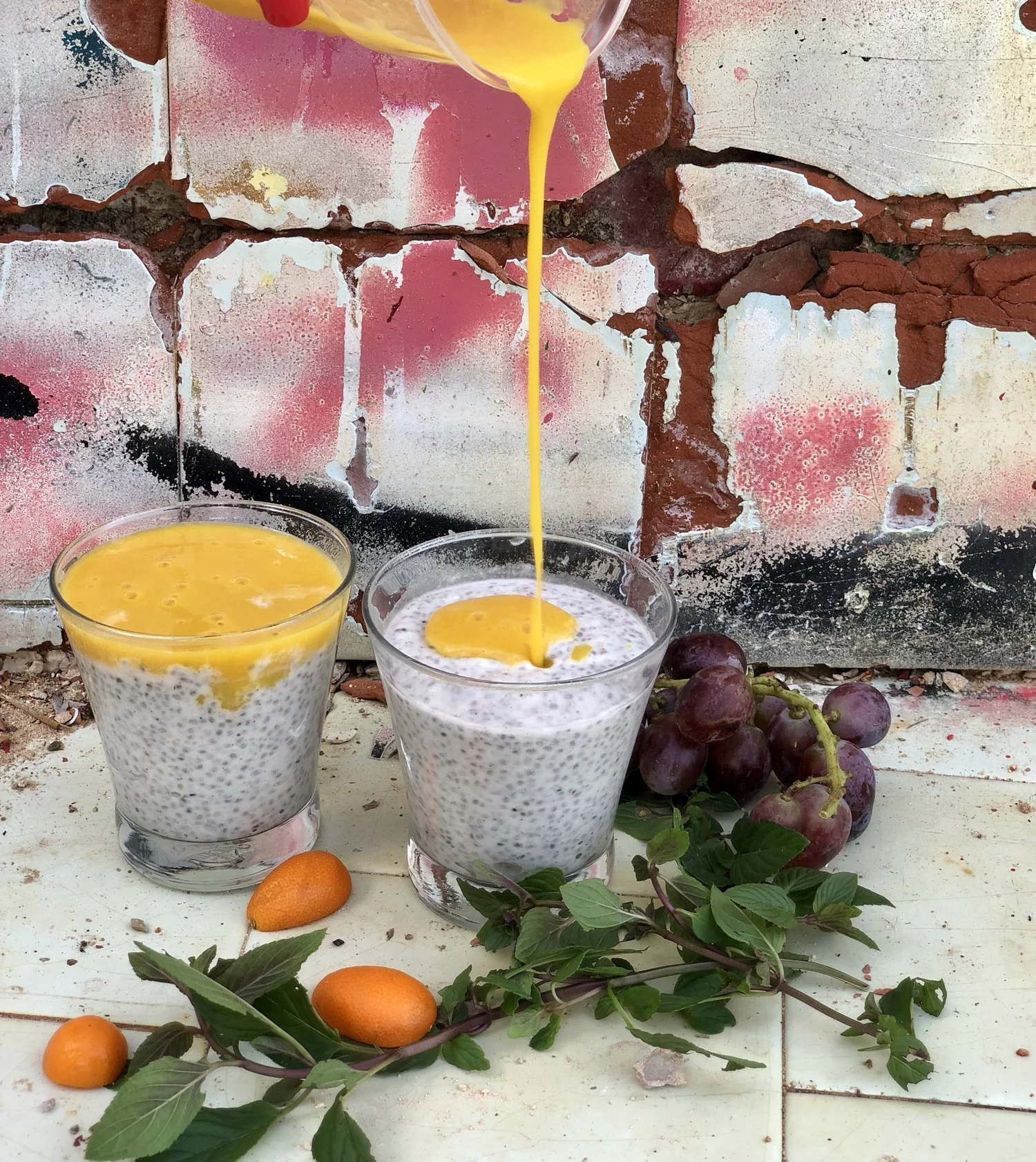 Mixa 250g tinad fryst mango med en banan och späd med en skvätt pressad apelsin. Fördela chiapuddingen i glas och toppa med smoothie och om du vill, lite granola eller rostade frön. God morgon ❤︎