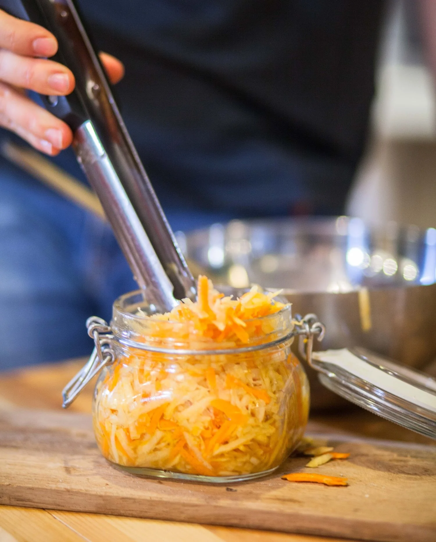 Skala och riv 400g kålrot och 400g morot grovt. Skala och riv 4 cm ingefära och blanda med 4 msk olja, 3 msk limejuice, 2 msk sesamolja, 3 tsk soja och 1 tsk spiskummin. Blanda dressingen med kålrot och morot och strö över sesamfrön.