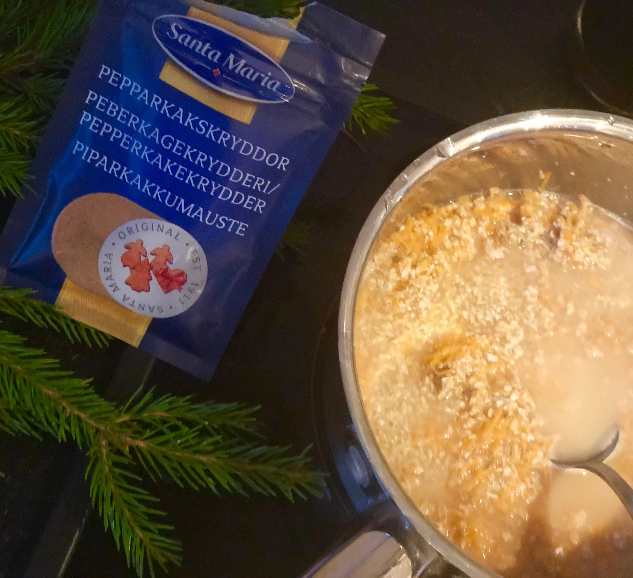 I en kastrull blandar vi 1,5dl steel cut oats, 1 riven morot, 1 msk riven kokos, 1 msk pumpafrö och 1 tsk pepparkakskrydda. Vi häller på 2dl havredryck och 2dl vatten och låter puttra på svag värme ca 6 minuter.