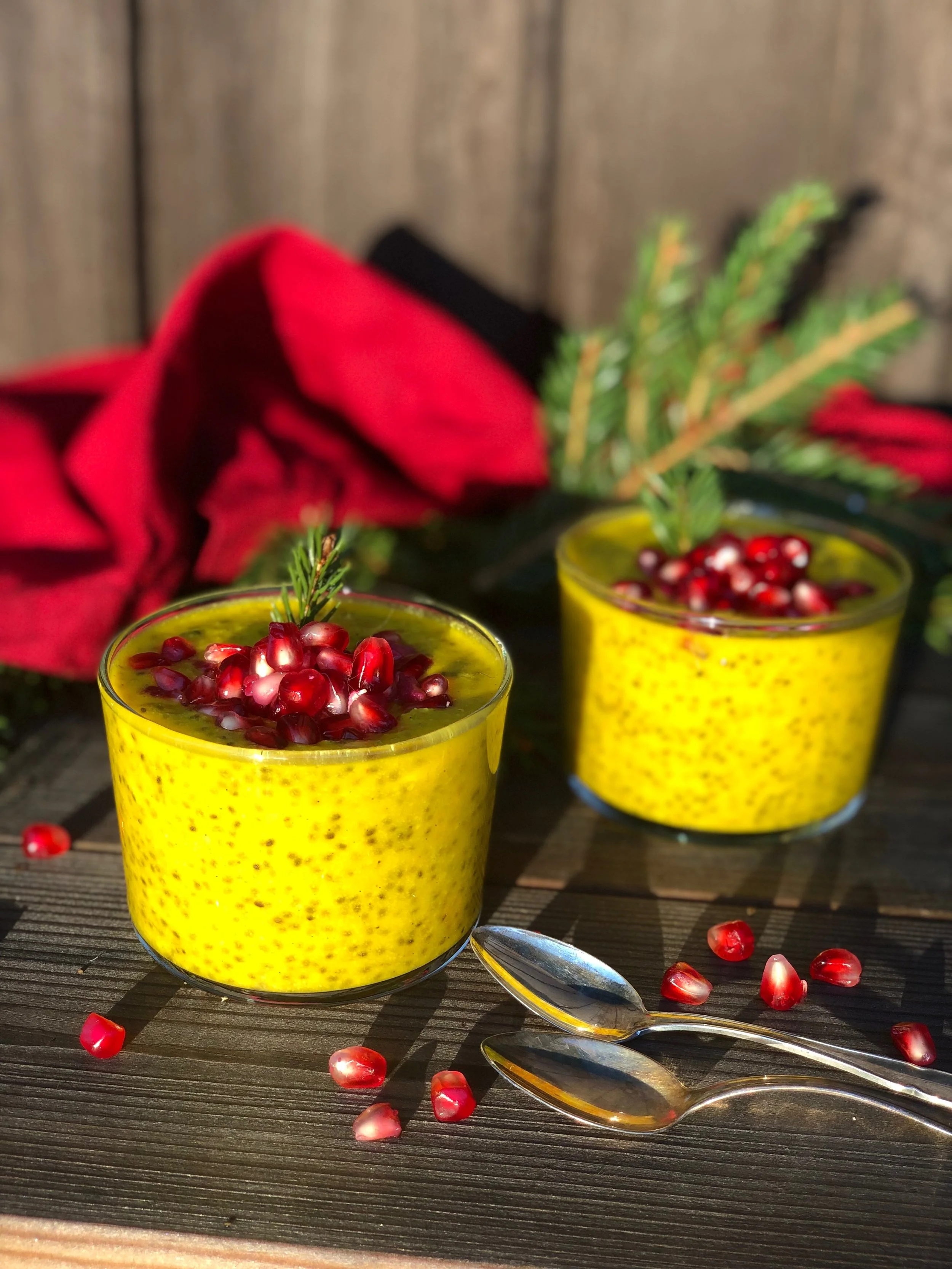 Blanda 4dl kokosmjölk med 2dl yoghurt eller kvarg, 1 dl chiafrön, 2msk honung och 1 pkt saffran. Rör om ordentligt och låt stå i kylen minst en timme, men gärna över natten.