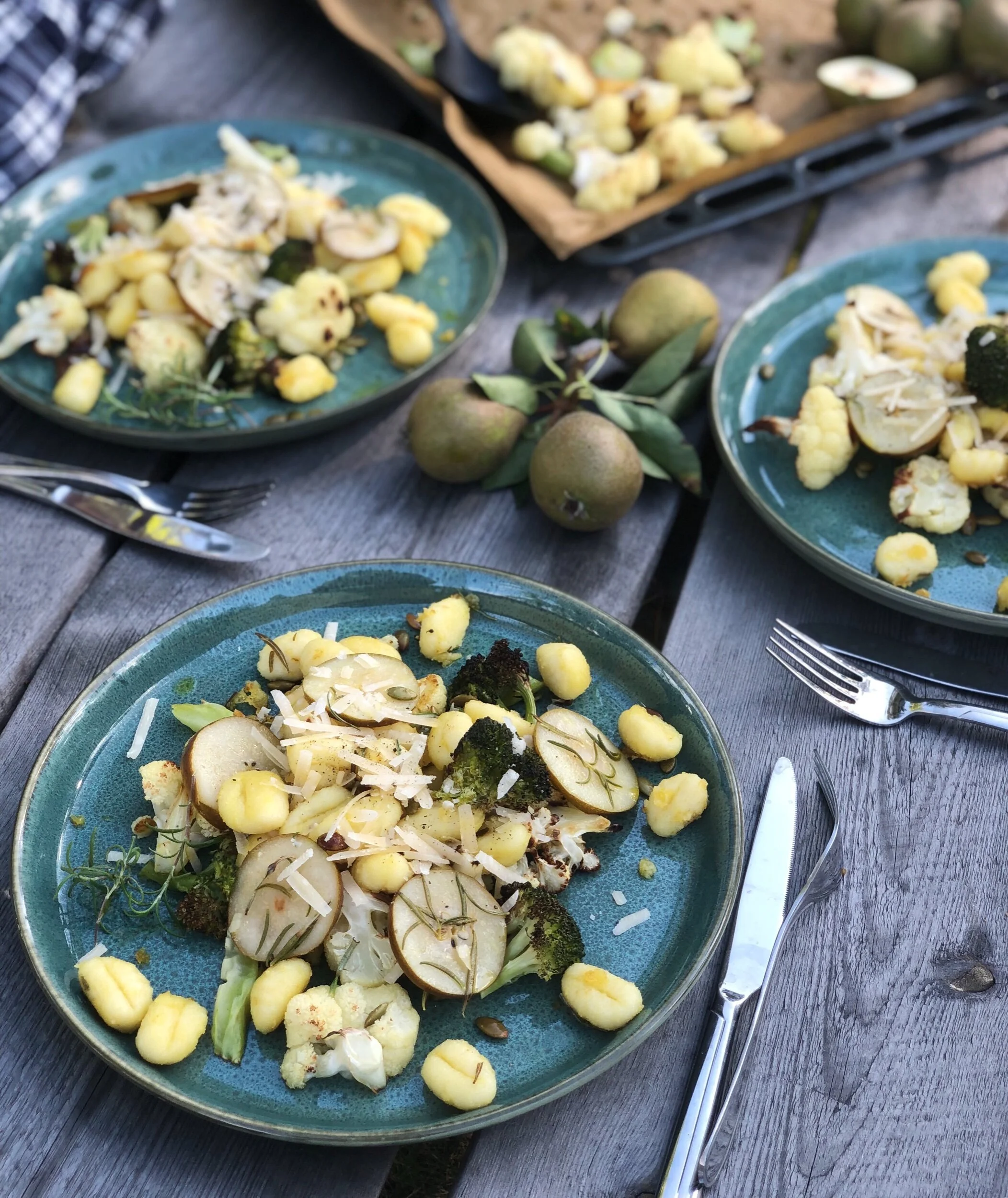 Häll lite mer olja i pannan och stek nu gnocchin gyllene. Blanda gnocchin med päron och grönsaker. Riv över ost, lite mer rosmarin och strö över pumpafrön. Servera direkt!