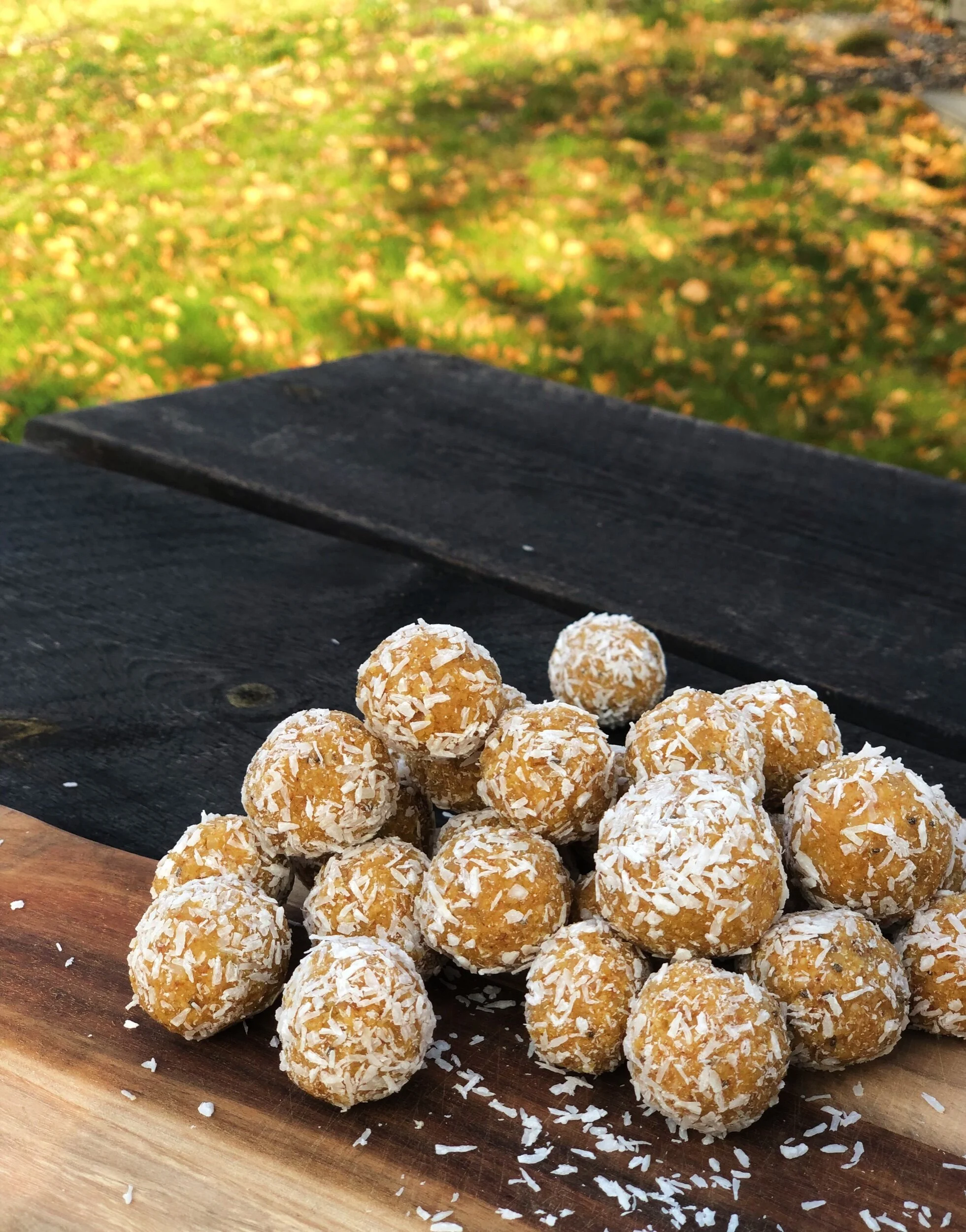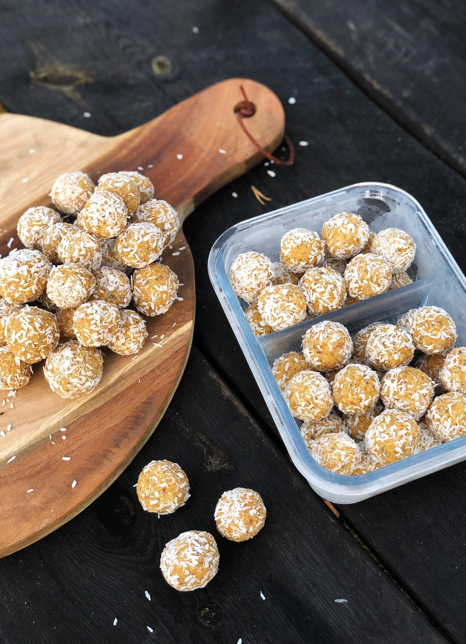 1,5dl riven kokos (+ 3 msk att rulla i)