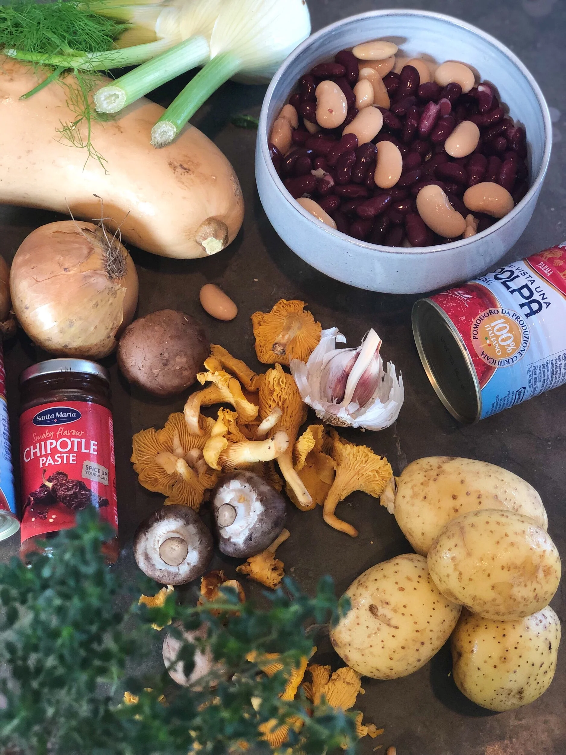 2. Rensa kantarellerna och riv eventuellt till mindre delar om svampen är stor. Ansa, skölj och strimla fänkål och selleri. Lägg ner i grytan tillsammans med krossade tomaterna och skölj ur burkarna med lite vatten som du också har ner i grytan. Rör i tomatpuré, chipotlepasta, kakao, fond, vin, timjan och blanda allt.
