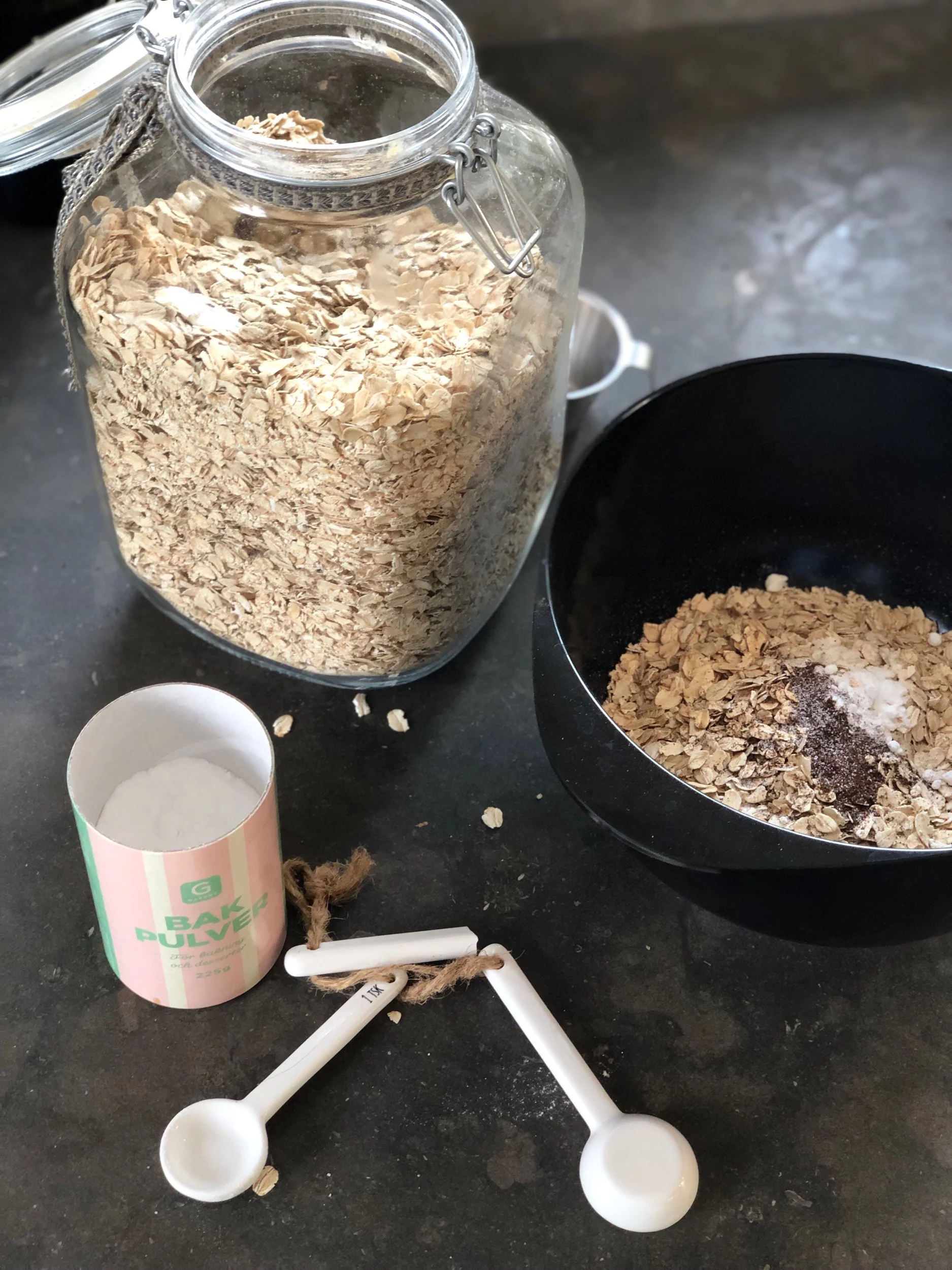2. Blanda havregryn med bakpulver, kanel, vaniljpulver, kardemumma och 0,5 tsk salt.