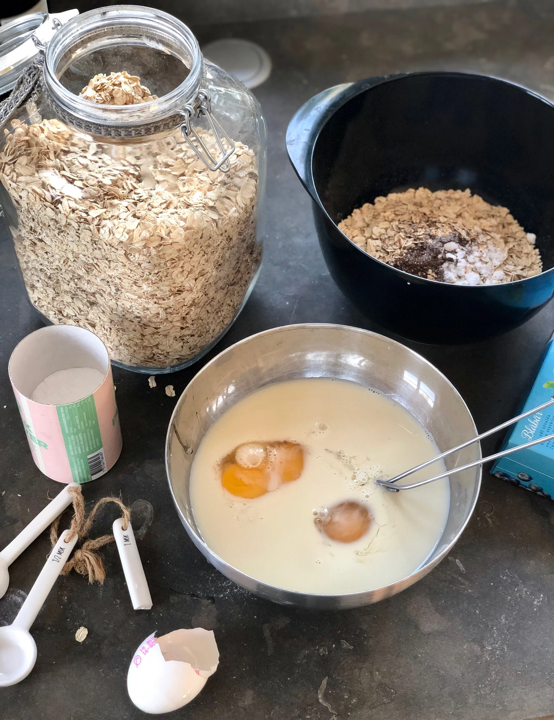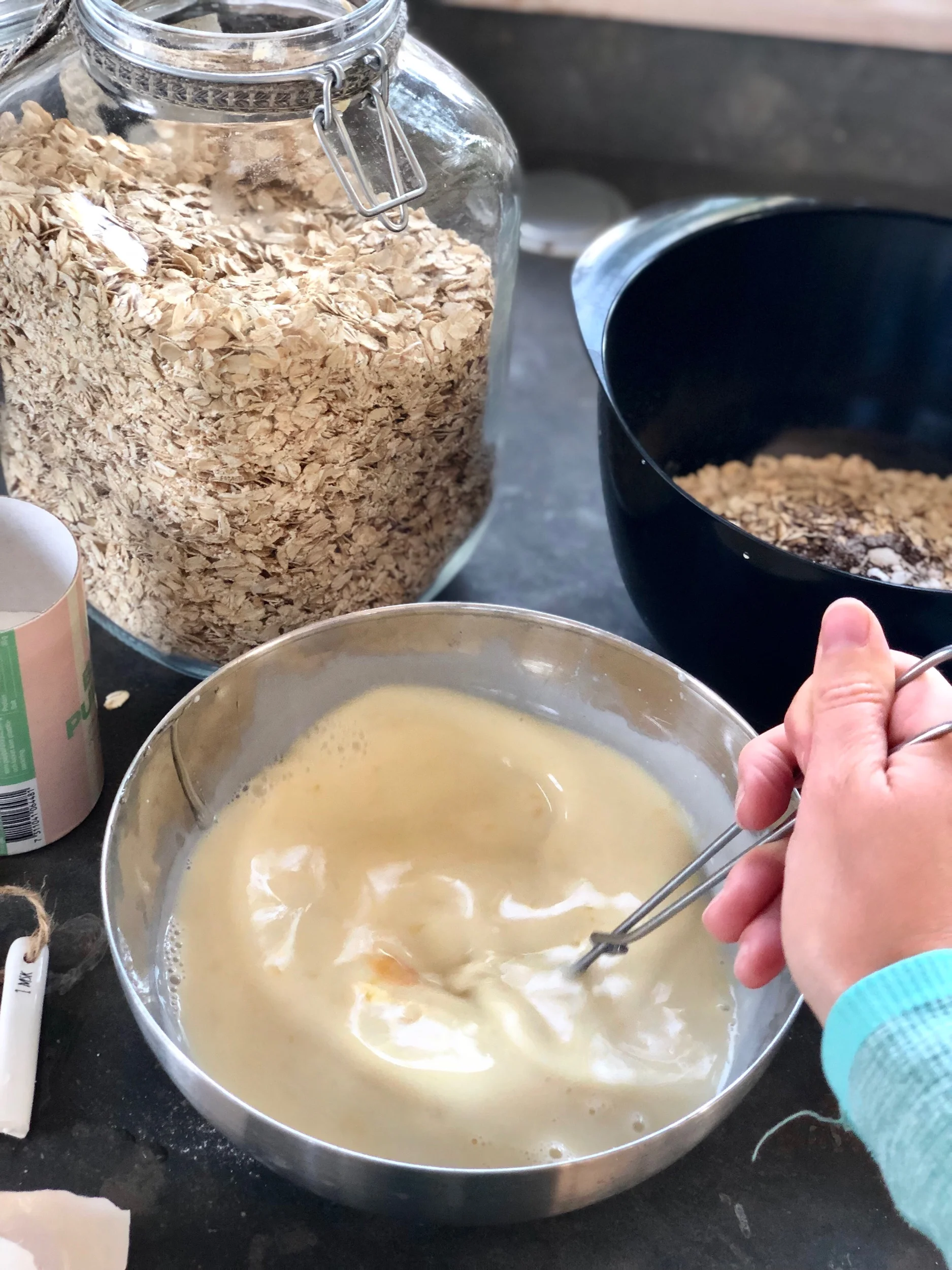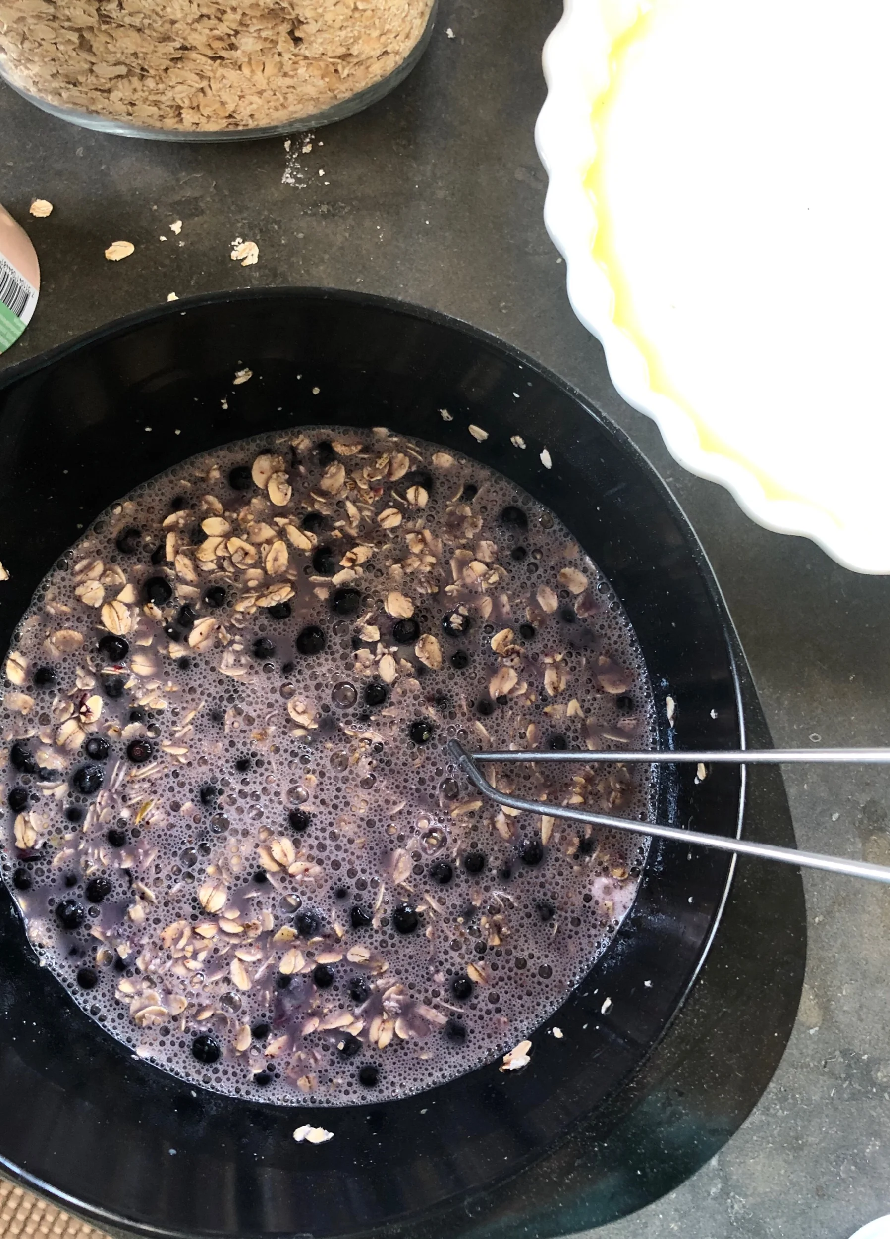 3. Vispa ihop ägg, 1 msk honung och havredryck. Vänd ner blåbären och blanda sen med de torra ingredienserna.
