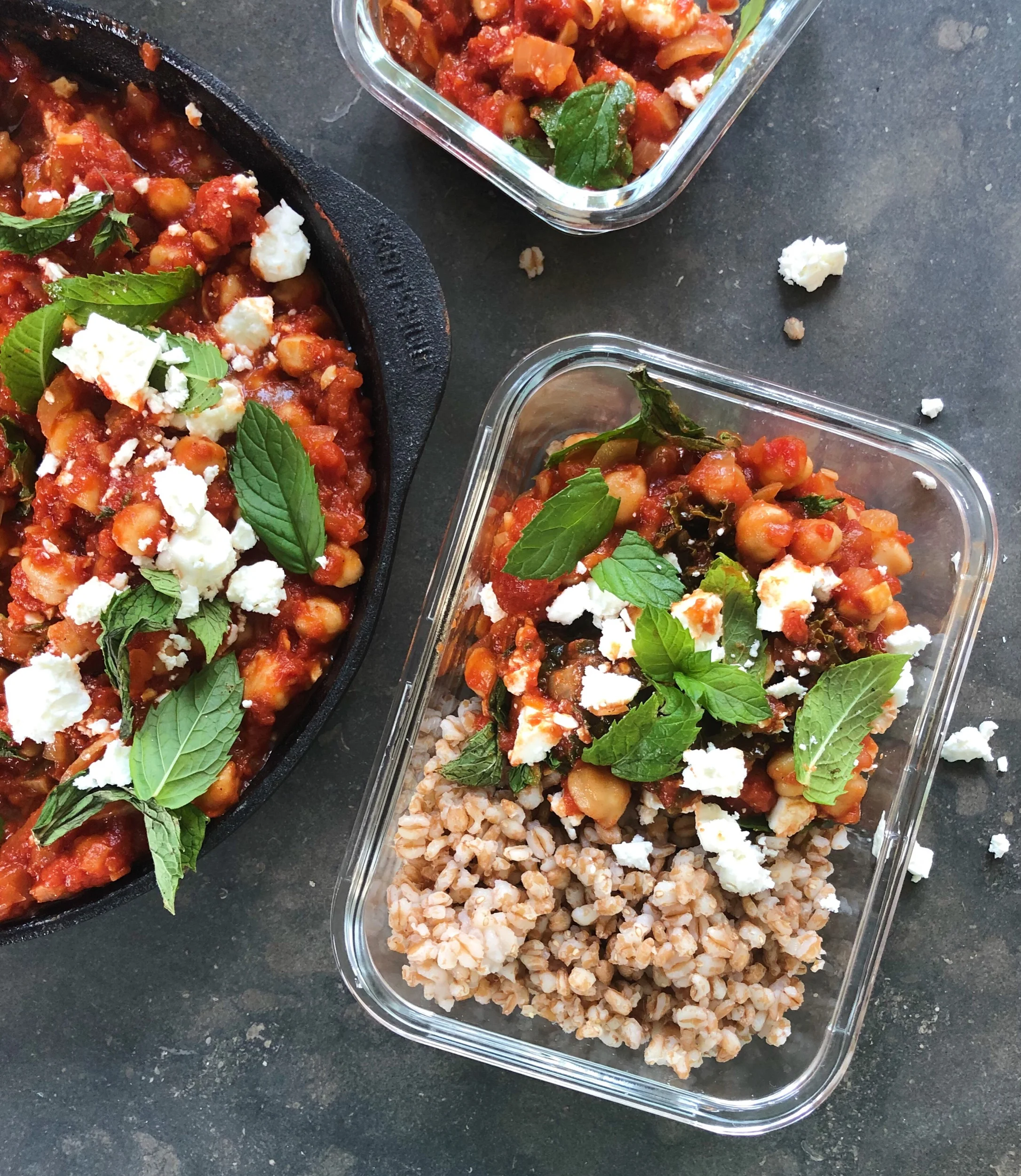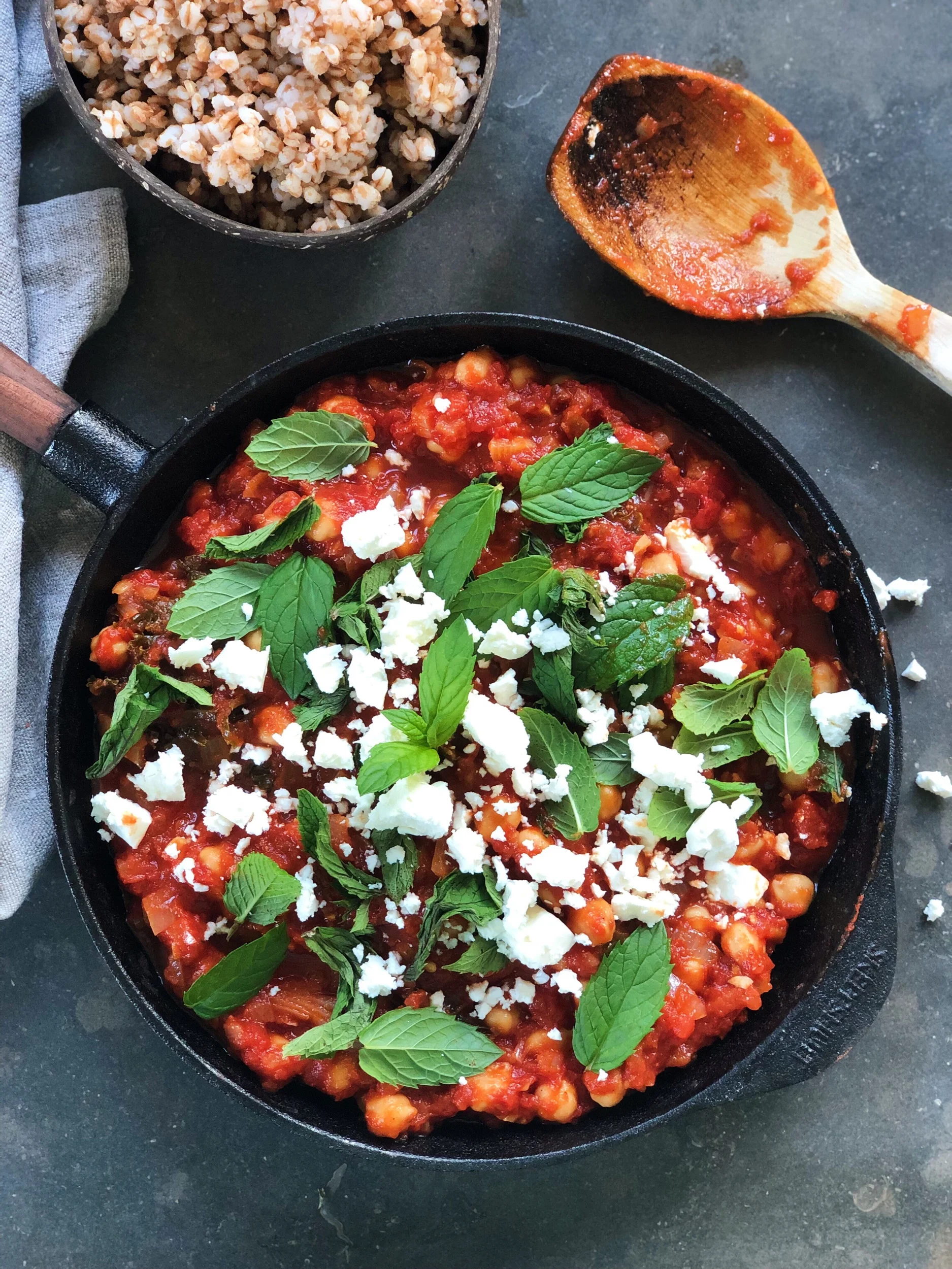 Ansa grönkålen och lägg låt koka med de sista minutrarna. Smaka av med salt och peppar. Strö över mynta och feta och servera med kokt matvete.