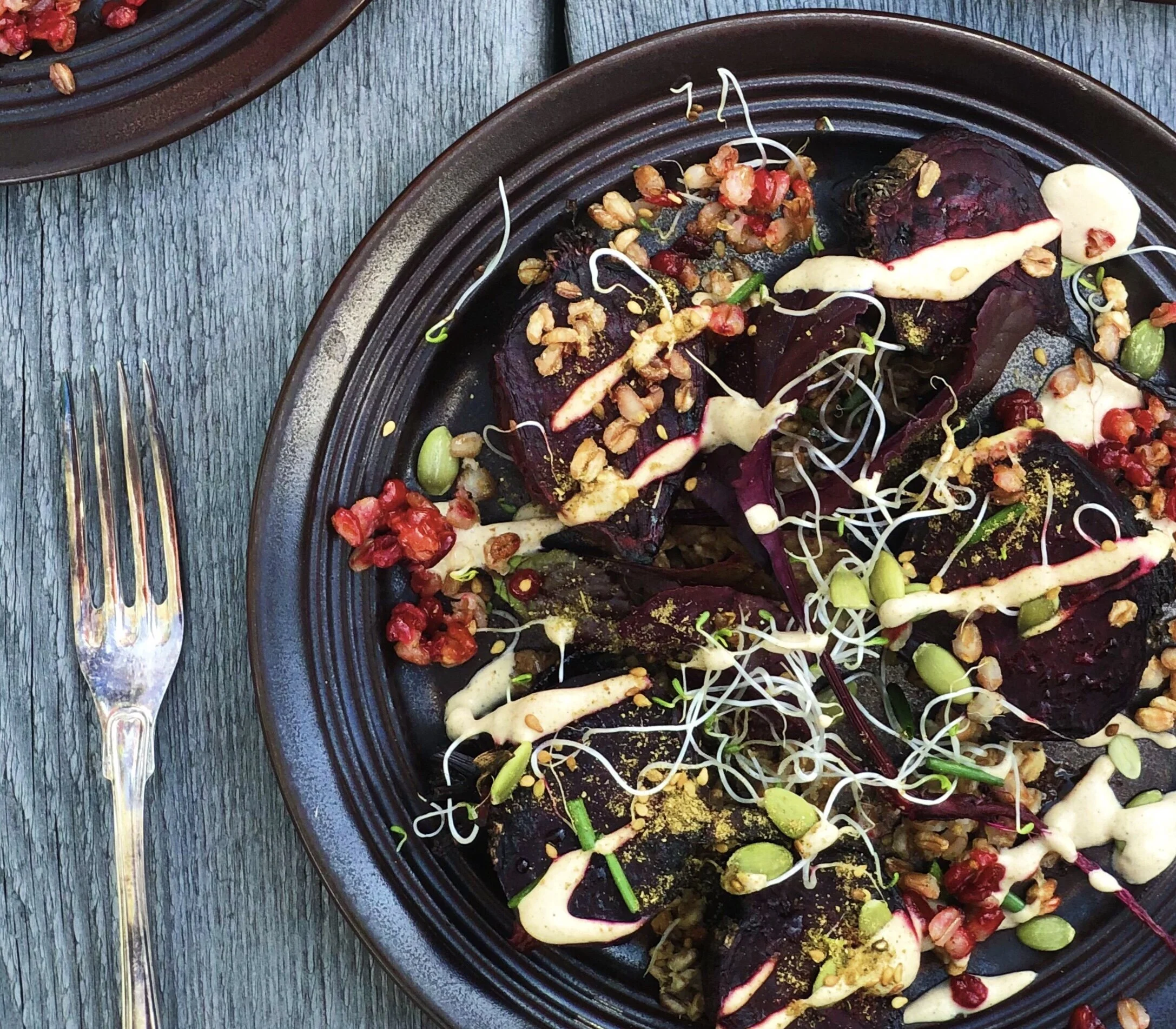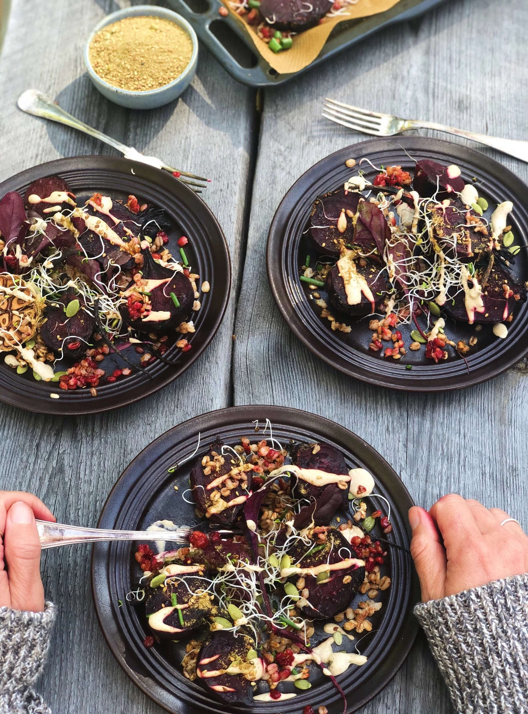 Rostade betor med tahinisås, zaátar och mikrogrönt