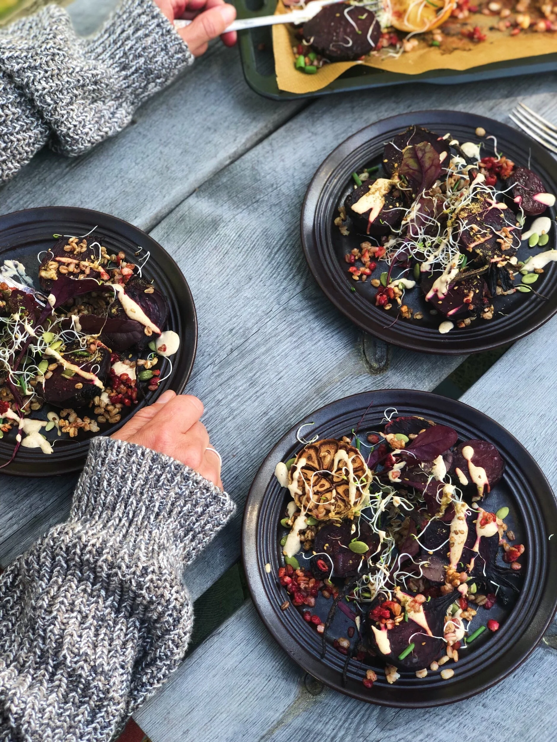 När vi kom på att vi skulle rosta matvetet i ugnen, fick vi med oss även de lite mer skeptiska matgrynsätarna. Så vill du ha den här rätten lite mer matig, koka matvete och strö på plåten med betorna och låt rosta med de sista 10 minuterna.