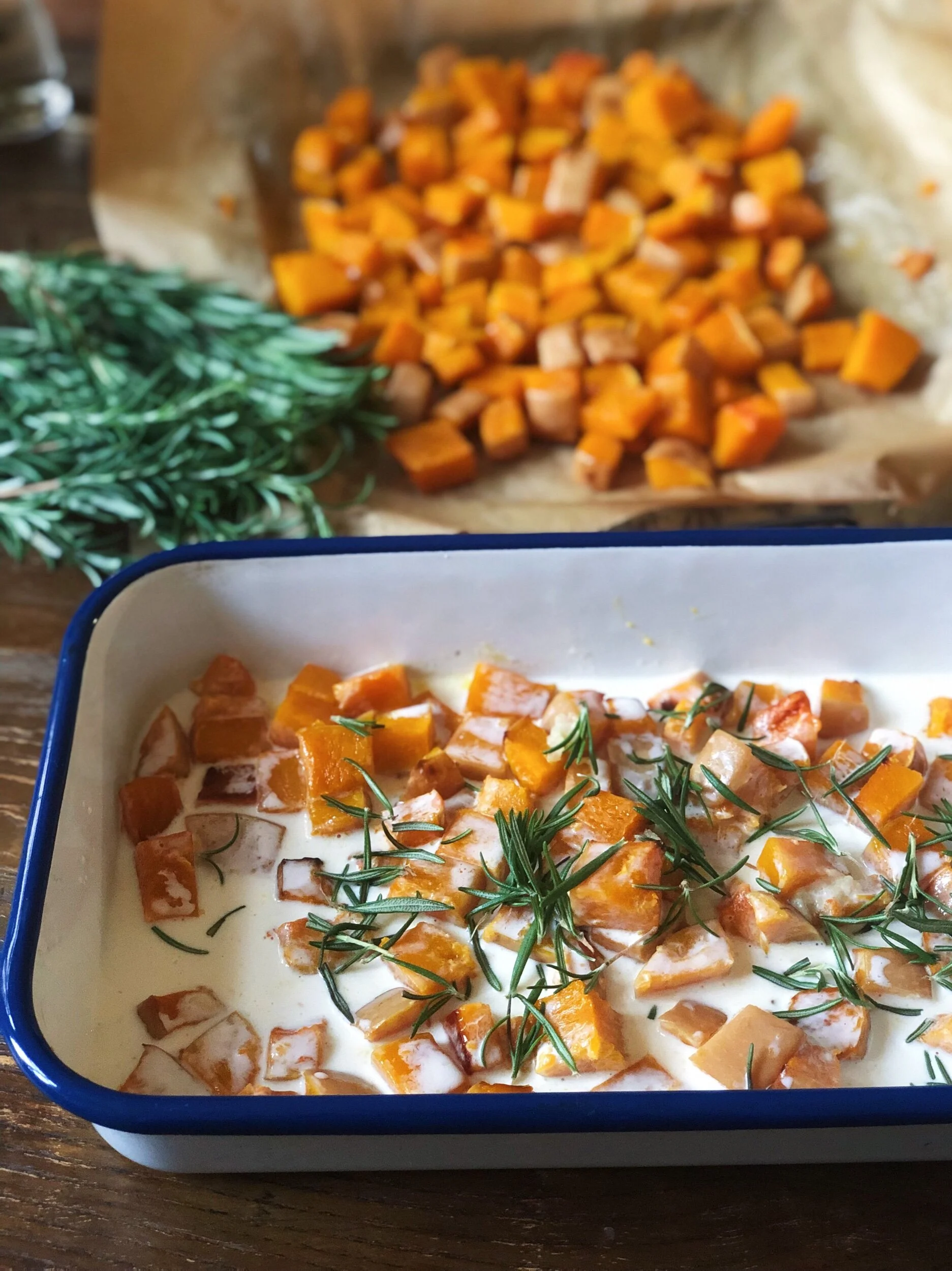 Häll över pumpan i en ugnsform, pressa ner den rostade vitlöken, slå på havregrädde, bönor och rosmarin och ställ tillbaka i ugnen så allt blir varmt. Häll pastan i ugnsformen ihop med 1dl pastavetten, rör om, smaka av med salt och peppar. Servera pastan direkt från formen, gärna med grönkålschips eller spenatblad. Riv på ost om du vill!