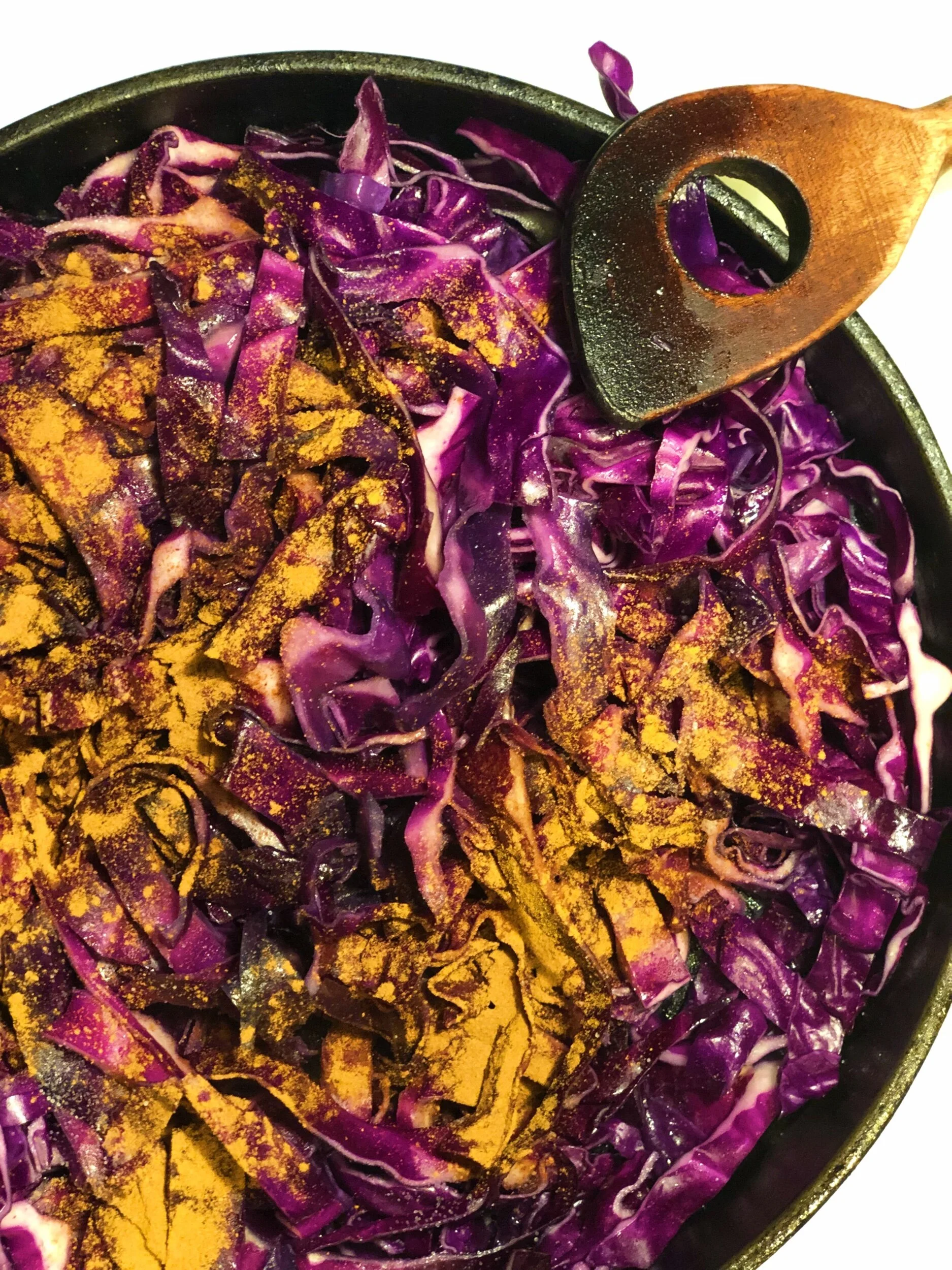 Skiva rödkålen tunt. Stek i panna med lite olja ca 5 min. Smaka av med kanel och salt