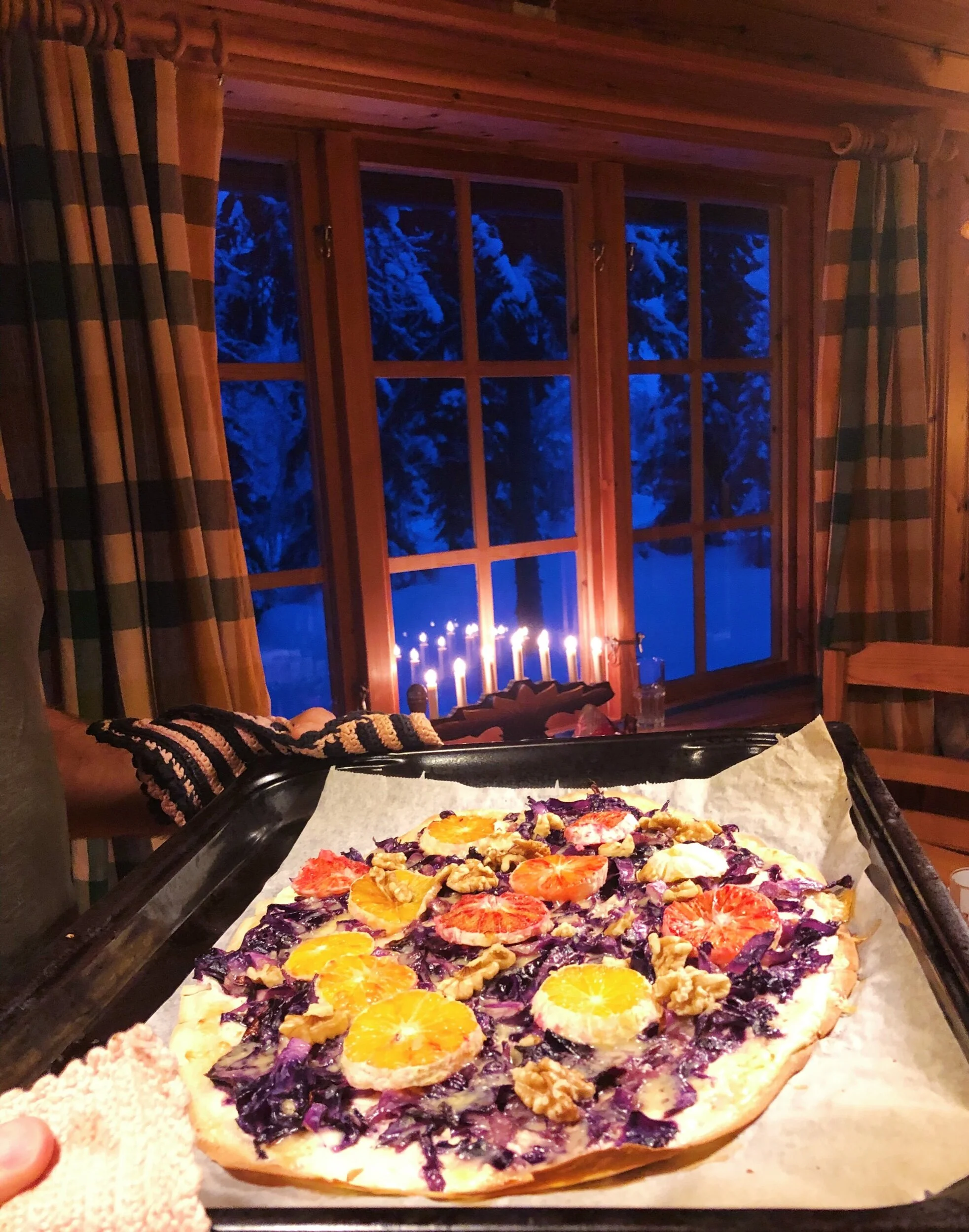 Ändå, när vi är matlata efter jul och vi kan svänga ihop en pizza av resterna, hurra! Här kommer vår pizza med kanelstekt rödkål och blodapelsin.