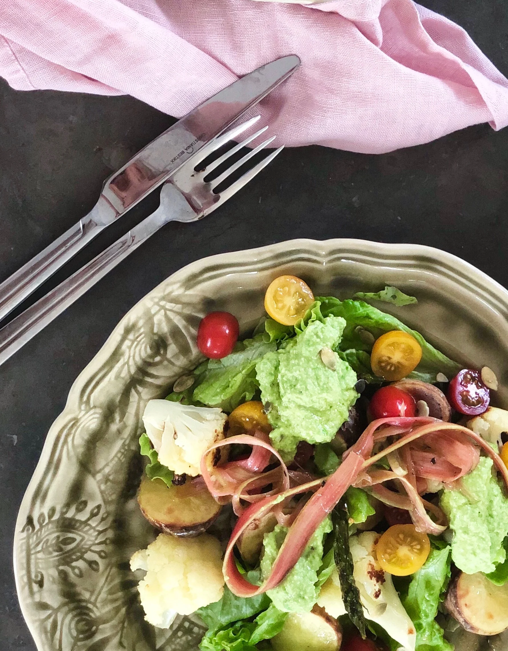 Servera rostad potatis, blomkål och sparris med färska tomater och salladsblad. Klicka på ärtpeston, lägg på rabarber och marinaden. Strö över dill och pumpafrön.