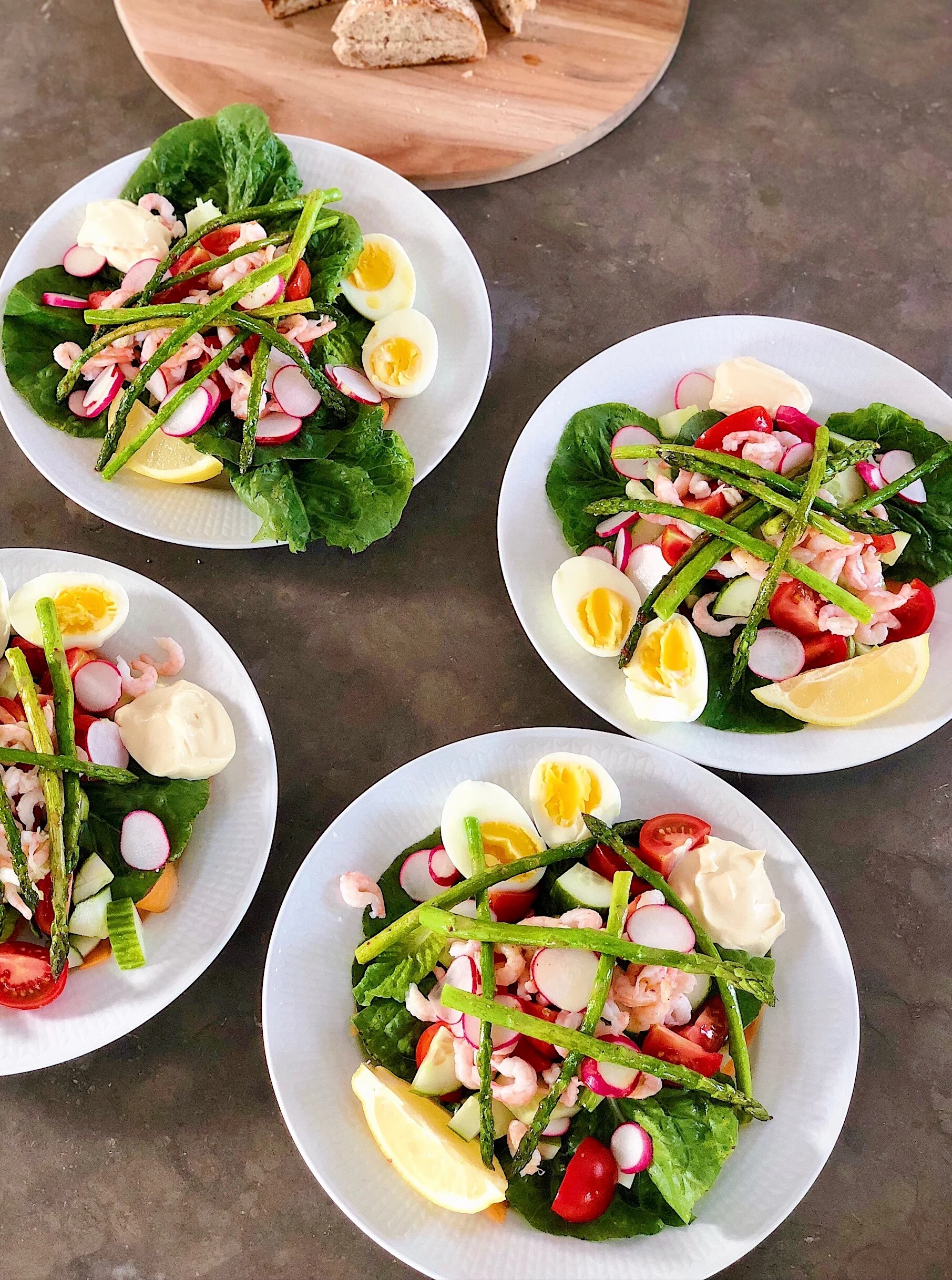 Lägg ut romansallad eller spenatblad på tallriken. Toppa om du vill med kokt quinoa eller bovete. Sen på med så mycket grönsaker du vill. Vi skivade tomat och rädisor och stekte sparris i olivolja . Koka ägg lagom krämmjuka, dela och lägg på.