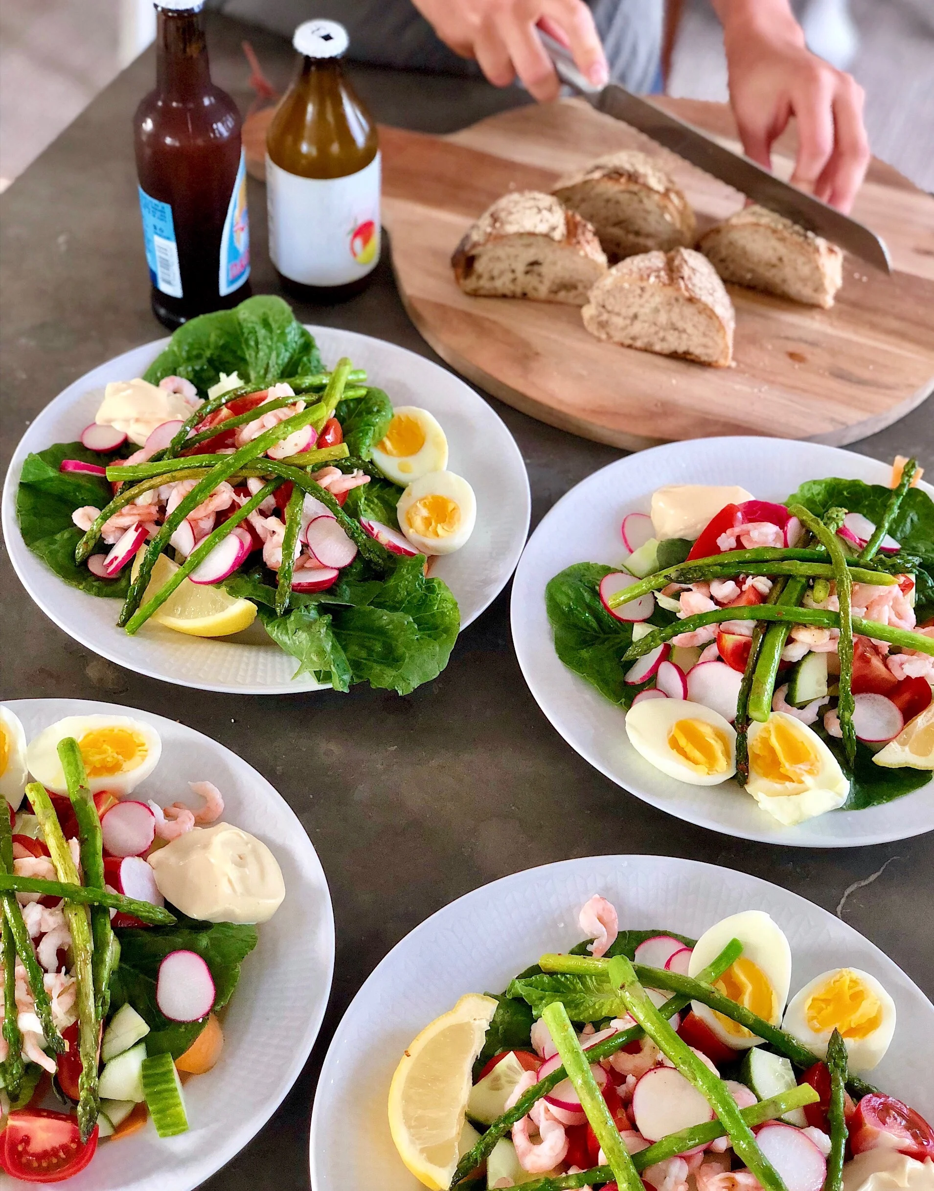 Lunchen igår. Tog 10 minuter och blev somrigt god. Plockihop sallad fungerar alltid kan vi tycka. Försöker alltid ha grönsaker i kylen, gärna några som håller bra, som kål och morot. Sen kokar vi en stor kastrull med en matig bas så som matgryn, bovete, quinoa eller bulgur och i buljong och har klart i kylen. Laddar upp med några goda ostar, tofu, räkor, falafel och lite rostade fröer eller nötter. Då är en god sallad sällan långt bort. Sen att den här sommaren till och från bjuder på 12 grader och regn och att vi mer är sugna på en varm soppa, det är en annan sak det.