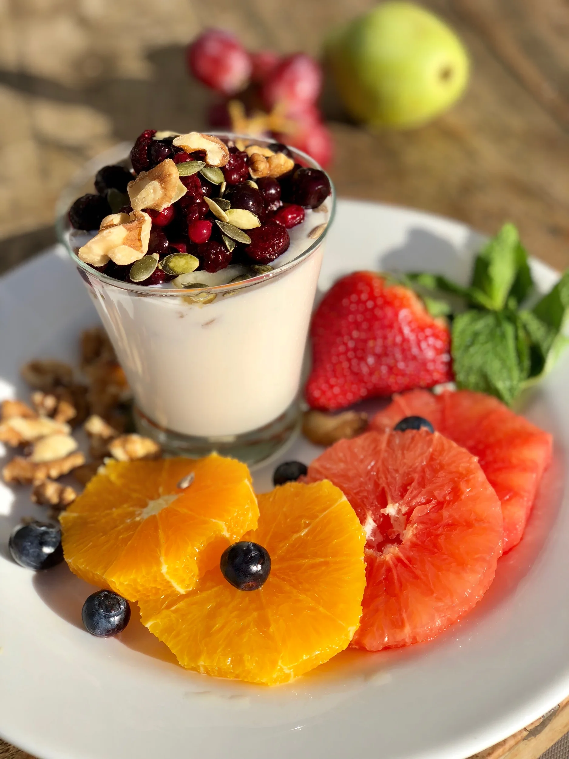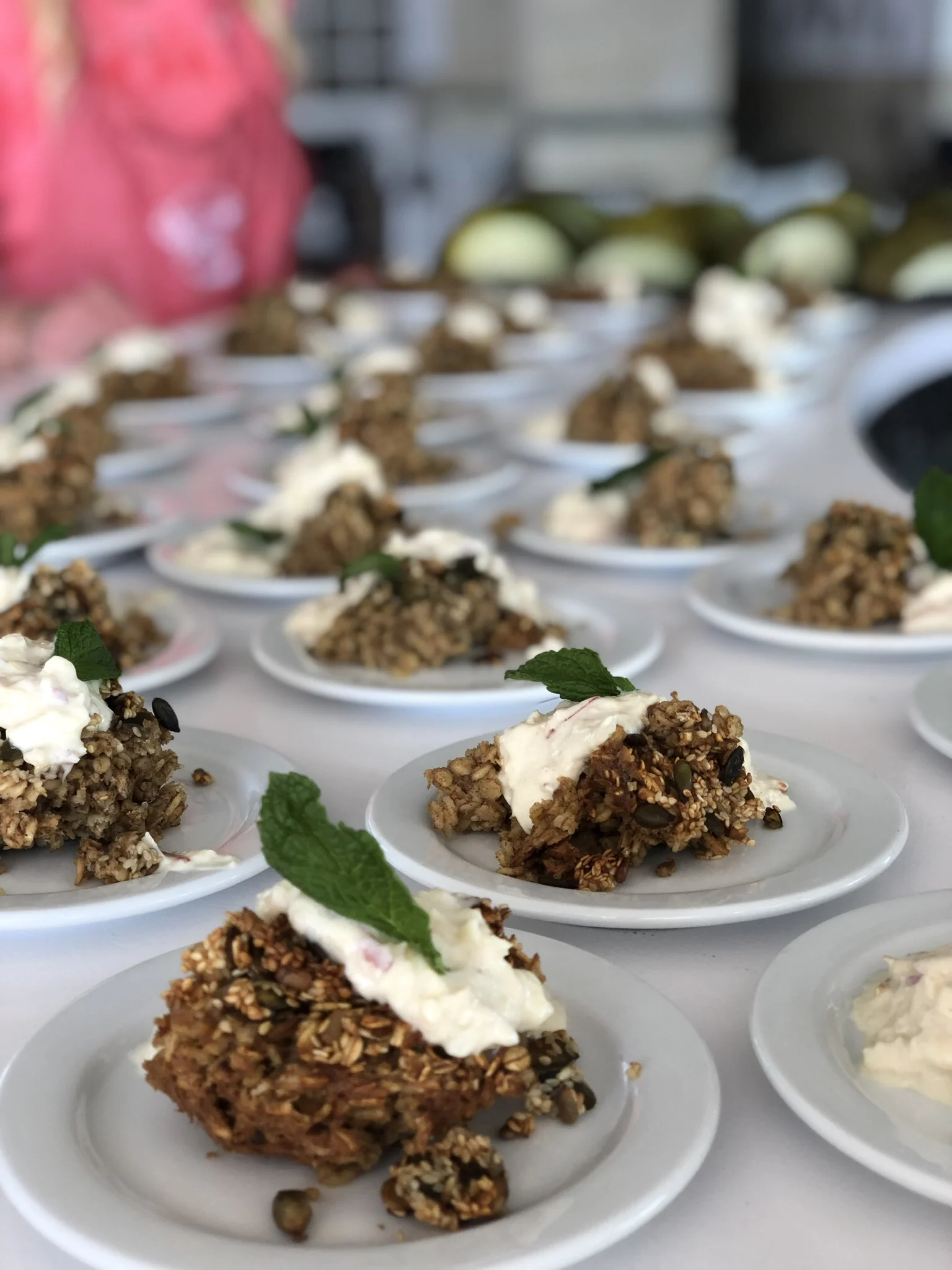 Bakad havrekaka med egenkryddad vaniljyoghurt och krispiga frön serverat efter ett corepass och innan ett danspass.