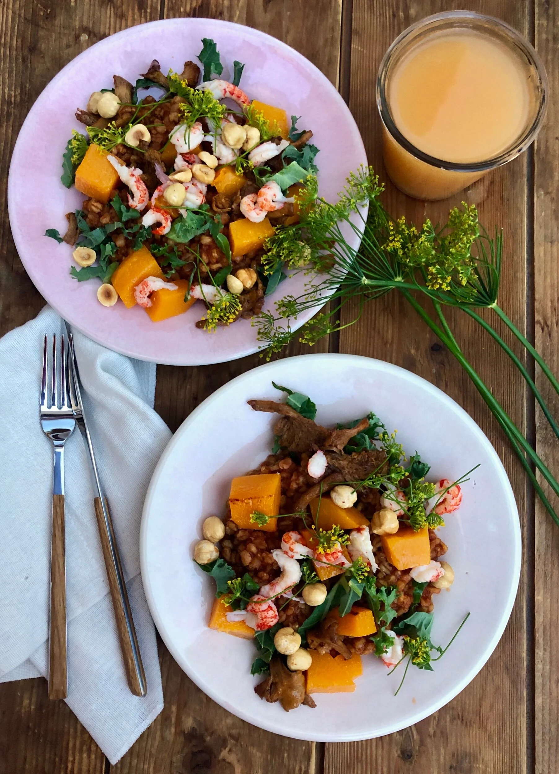 Servering: Fördela den nu krämiga tomatkokta matveten på tallrikarna, på med pumpa och kantareller. Toppa sen med avrunna kräftstjärtar, hasselnötter, grönkål och rikligt med krondill.