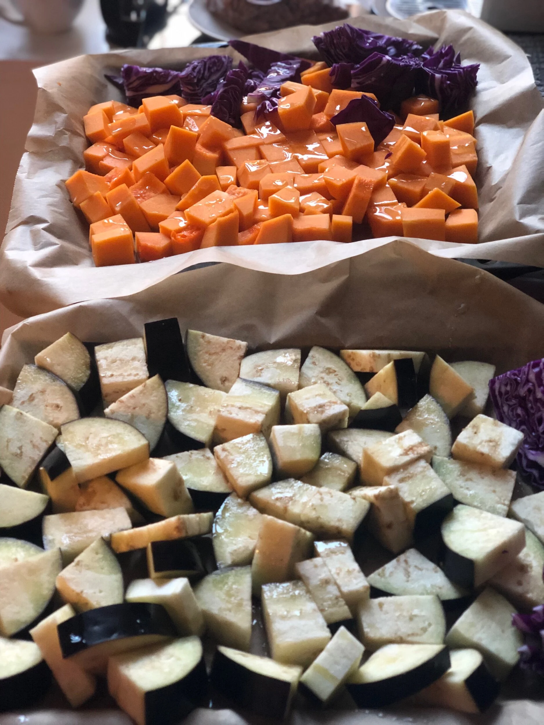 Vi passade på att lägga med några fler grönsaker på plåten som behövde bli uppätna. Rotfrukter och grönsaker som får rostas i ugn är perfekt preppmat att ha klart i kylen om inte annat.