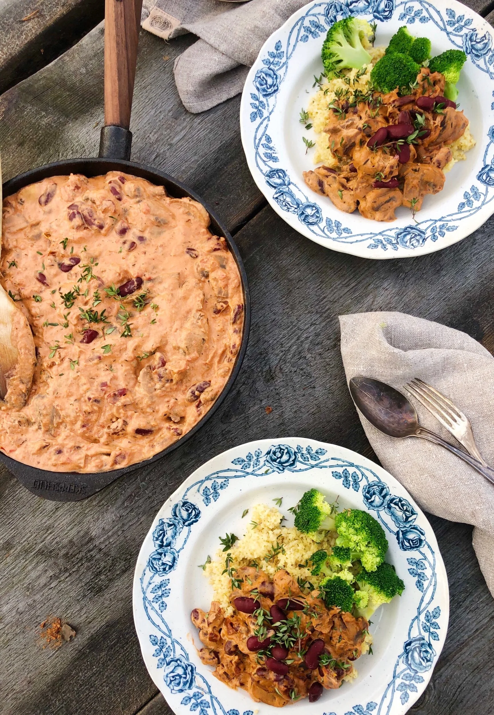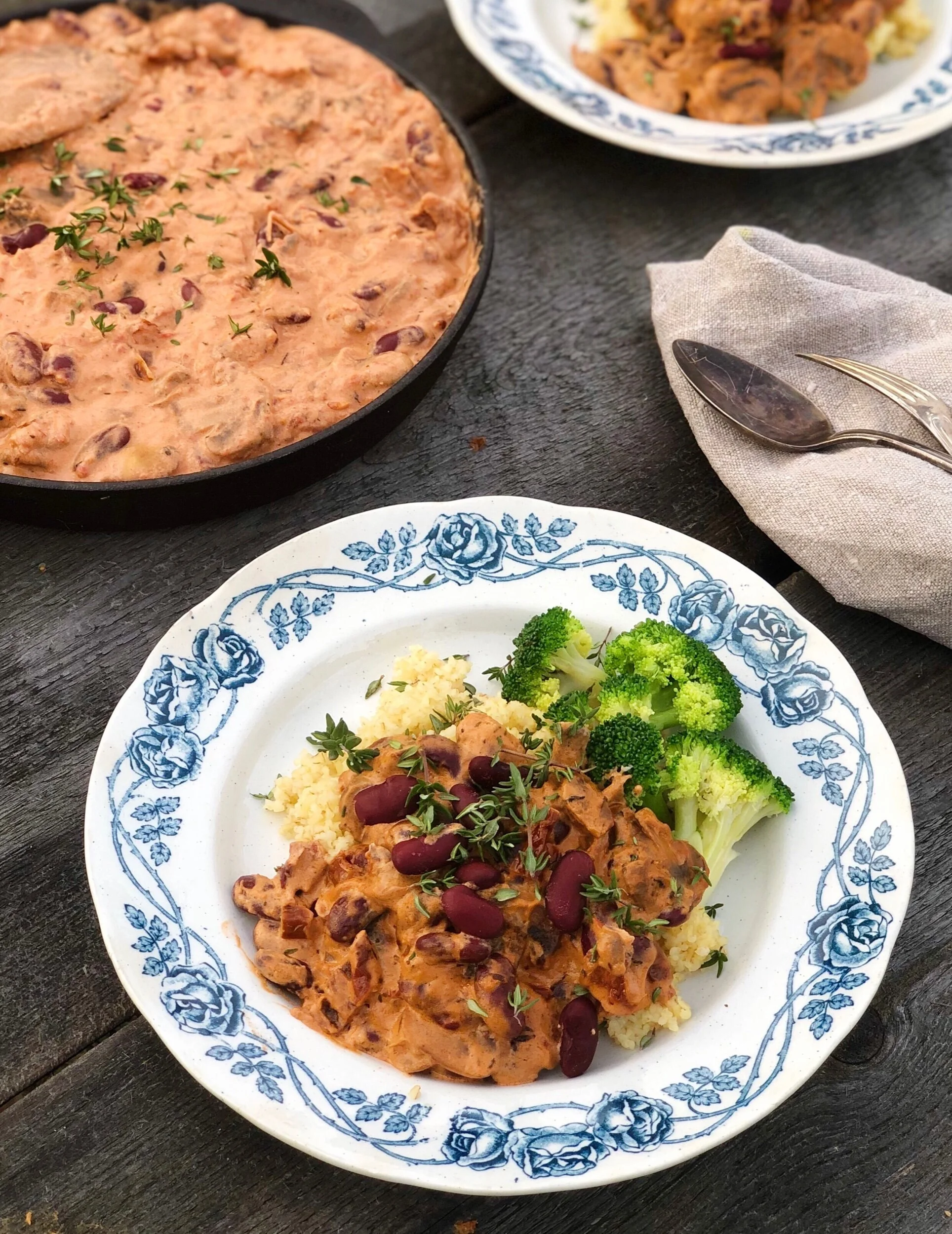 Champinjon Stroganoff med timjan och soltorkade tomater
