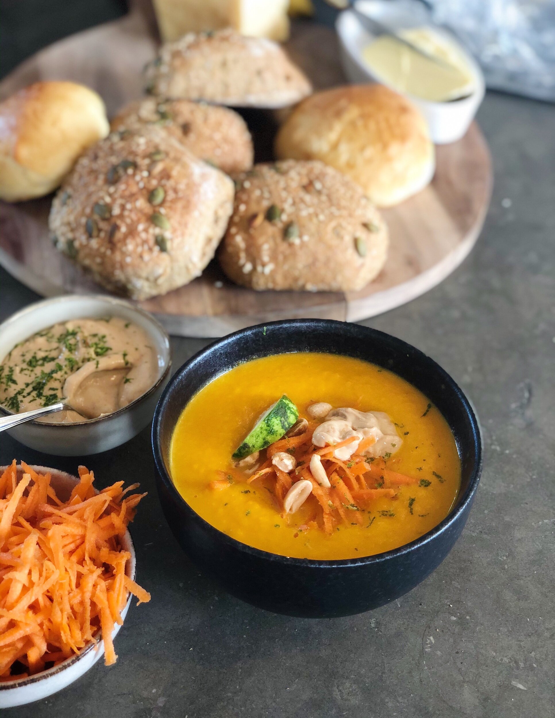 Servera soppan het och toppa morotsriv, jordnötspesto och limezest.