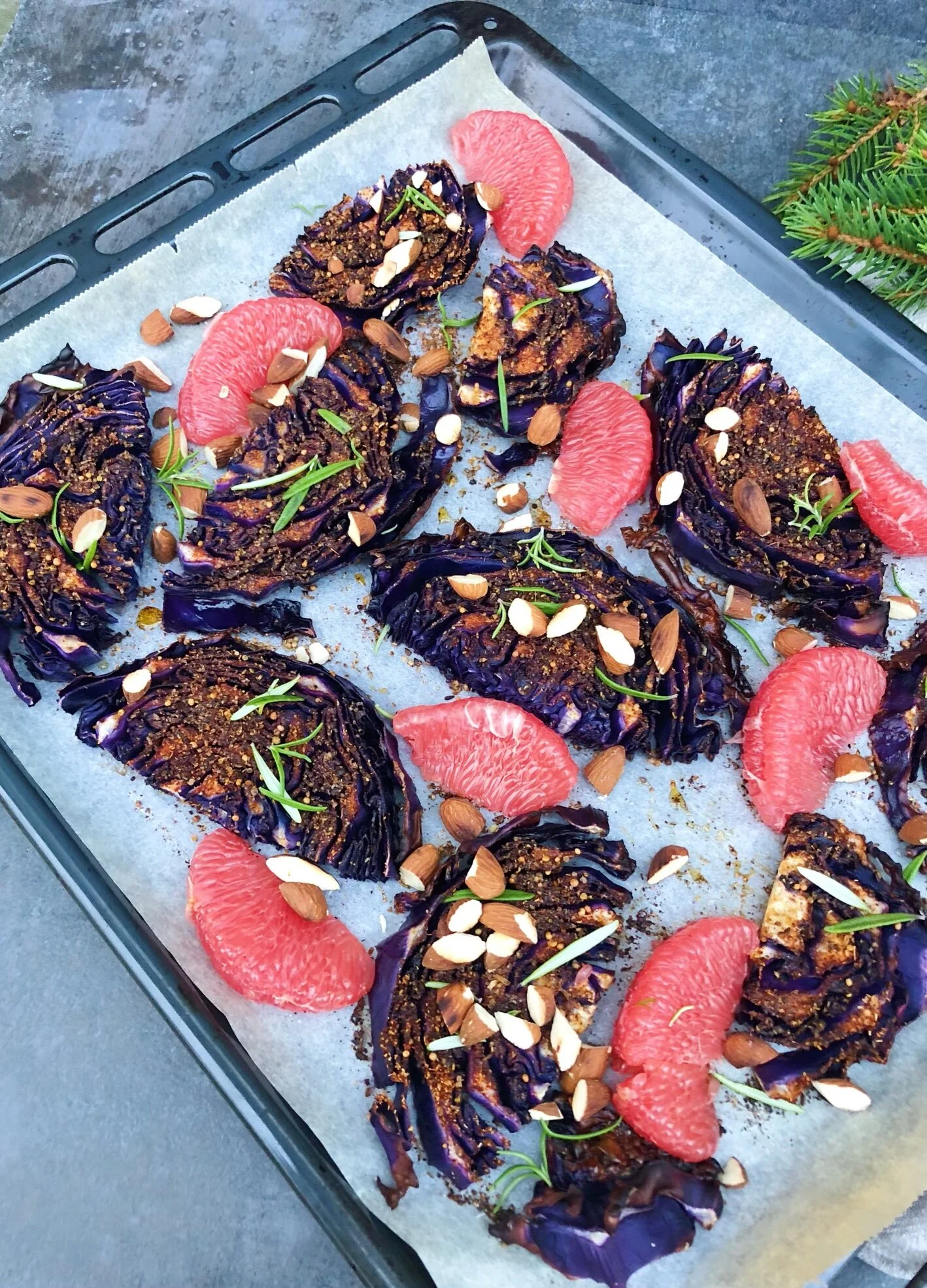 Här kommer vår rödkål 2.0. Julkryddad och med blodgrape och mandel! Som grönt inslag till julbordet, eller som tillbehör till lax. Gott som ensamrätt- då äter vi med sötpotatis och rostade kikärtor!