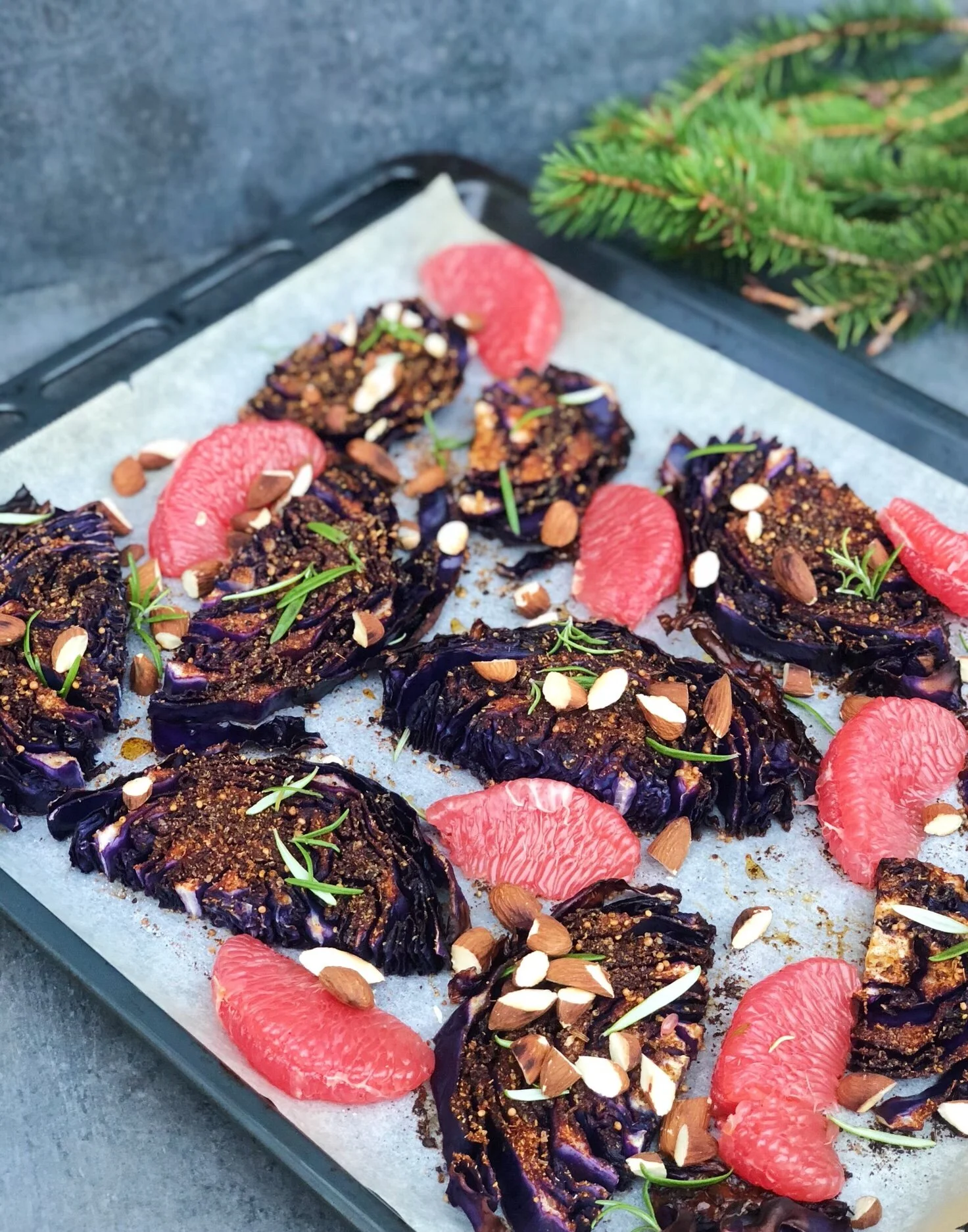 1. Sätt ugnen på 200 grader. Skär rödkål i klyftor och lägg på en plåt med bakplåtspapper. Ringla på olja och salta.
