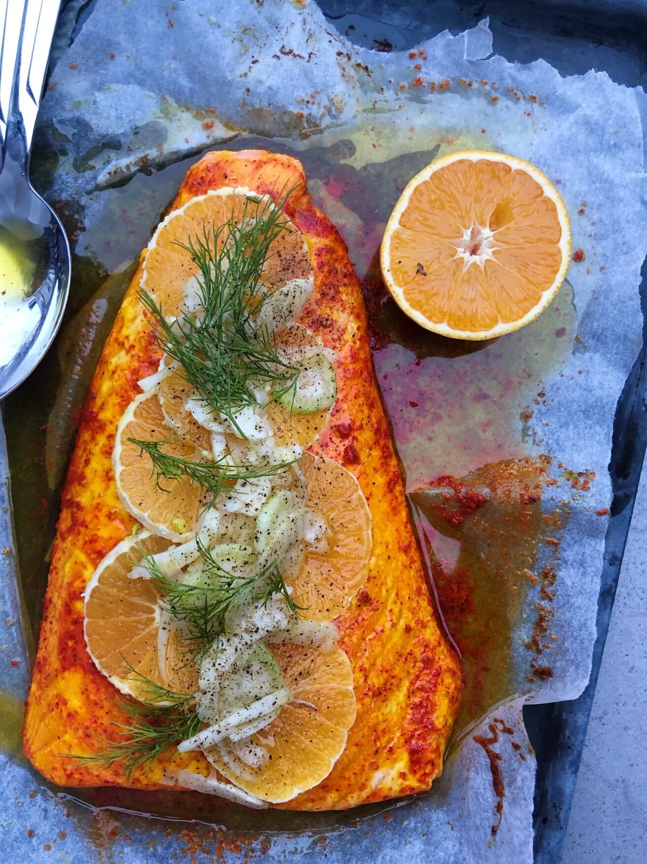 5. Toppa laxen med fänkålssalladen och apelsinskivor. Skeda smöret över laxen och servera som en del av julbordet eller väldigt gott som ensamrätt med kokt potatis.