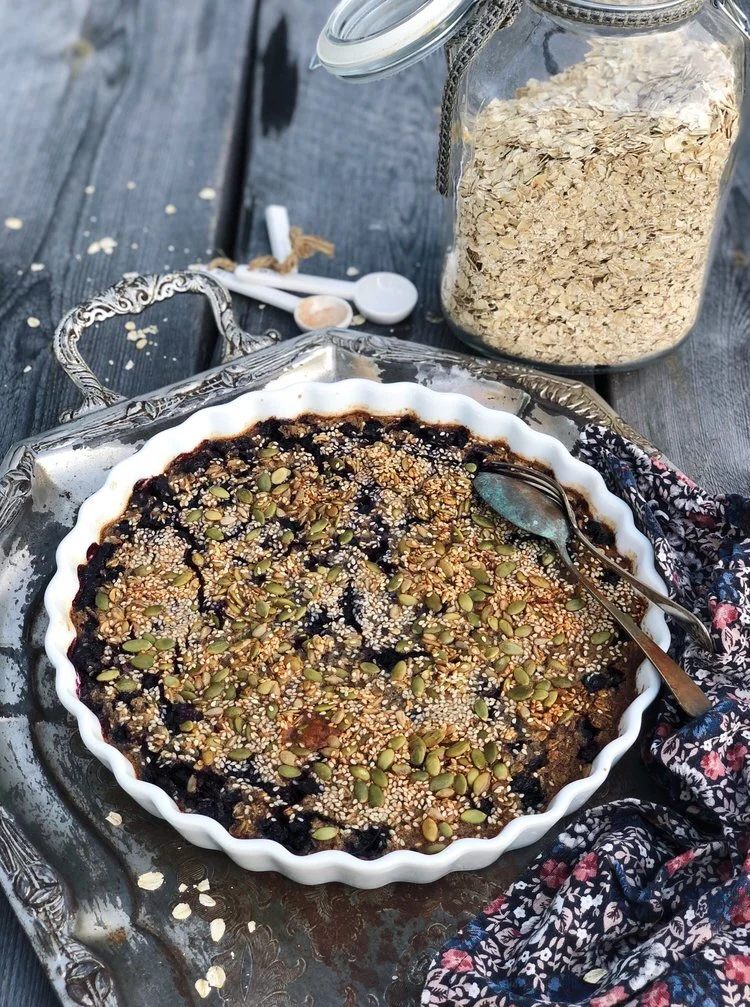 Servera bakad havre ljummen med lite yoghurt och extra blåbär.