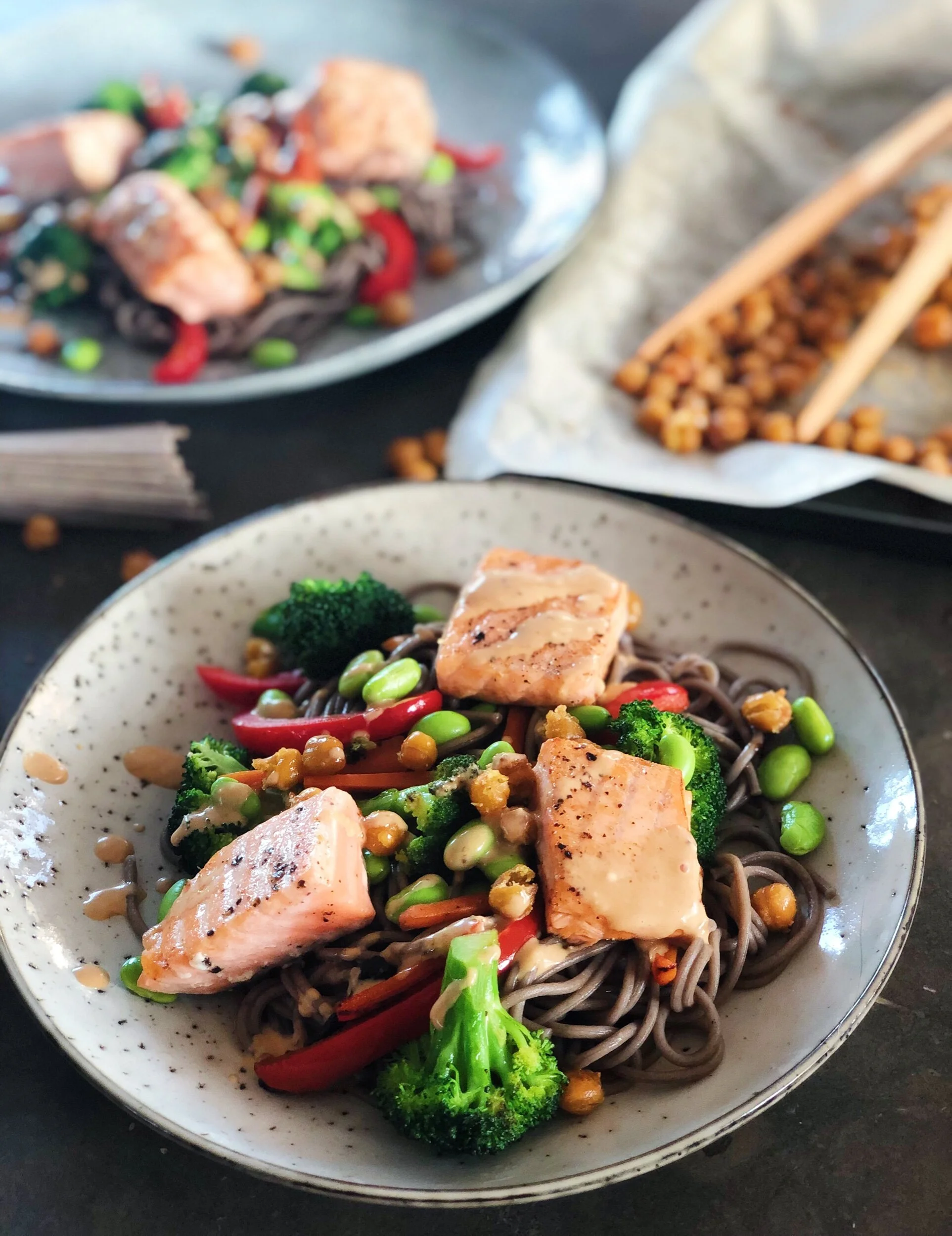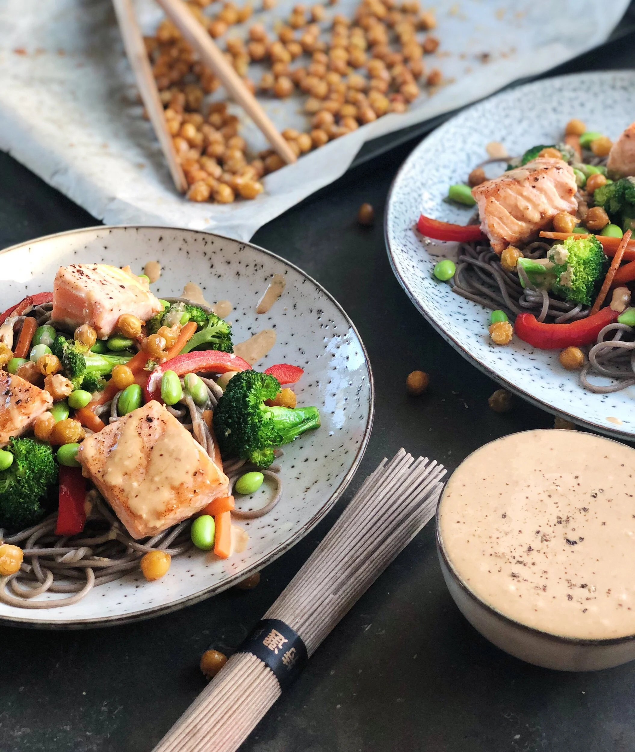 Koka nudlar enligt anvisningar på förpackningen och blanda med grönsakerna. Lägg på laxen, ringla på dressing och strö över rostade kikärtor.