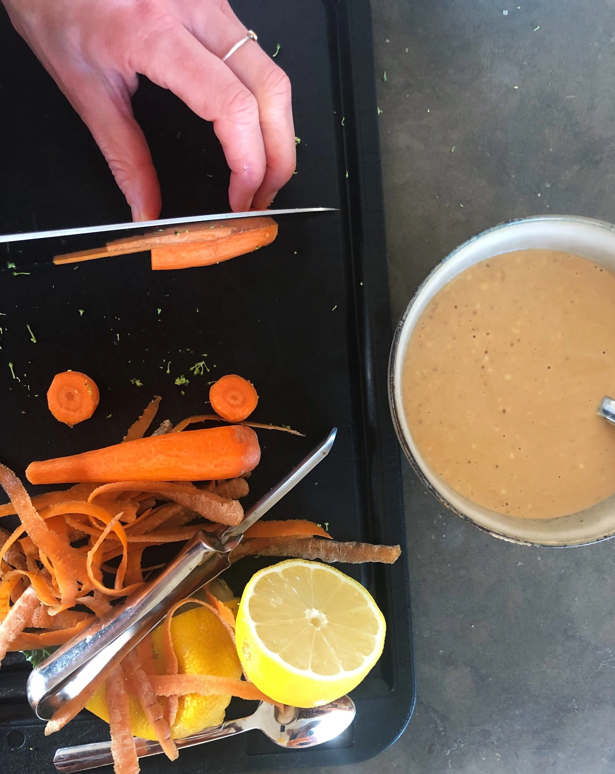 Vispa ihop pepparrot med miso, majonnäs, senap, 2 msk soja och citronjuice.