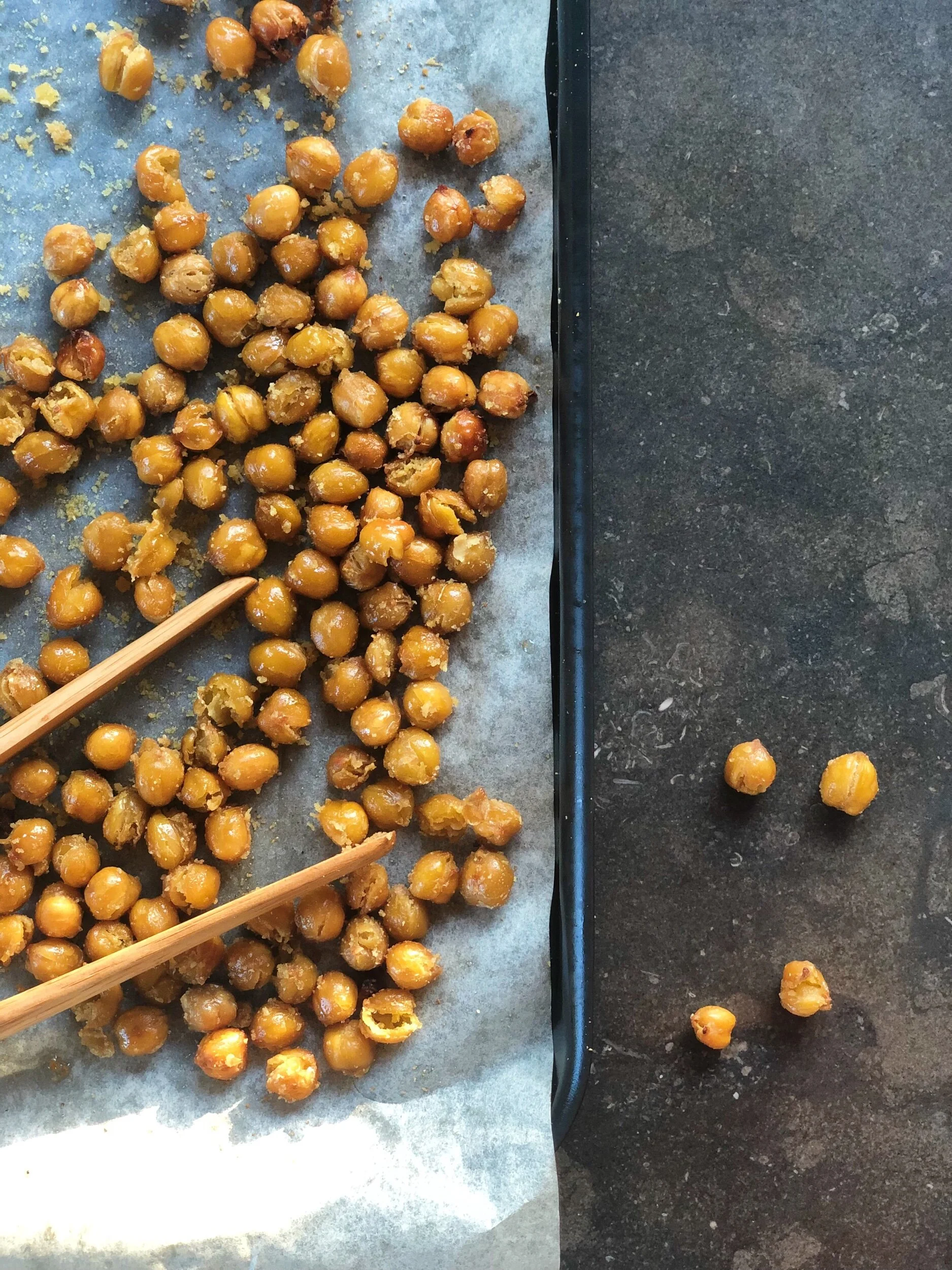 Sätt ugnen på 250 grader. Fördela kokade och torra kikärtor på en plåt med bakplåtspapper. Ringla på olja och strö över salt. Rosta i ugn ca 15 min. PS. gör gärna extra för är jätte gott att ha som snacks!