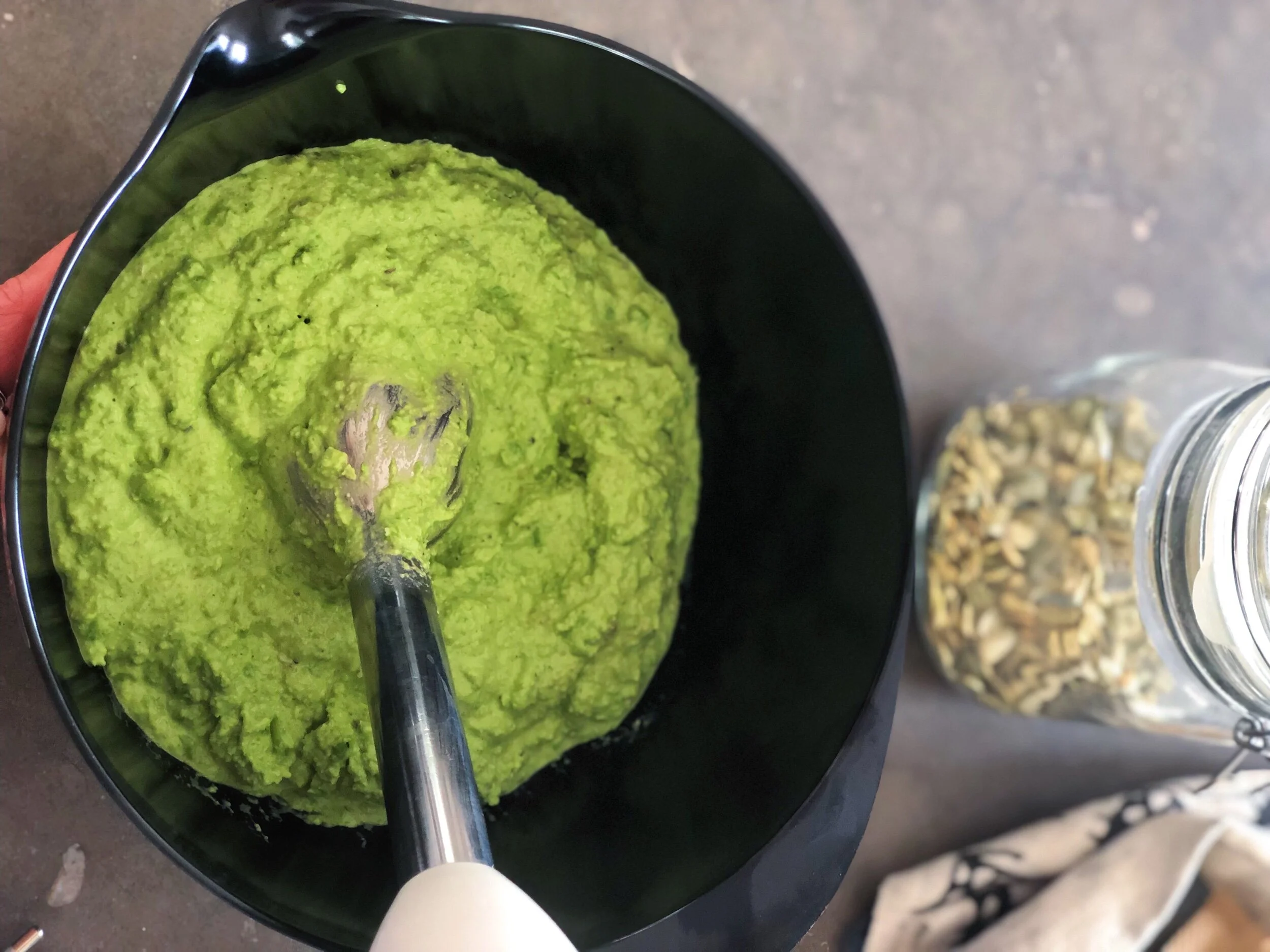 Mixa ärtor med solrosfrön, citronjuice och om du vill, ost. Smaka av med salt och peppar. Tillsätt valfri smaksättning om du önskar, men till frukostmackan föredrar i alla fall en mer naturell smak.