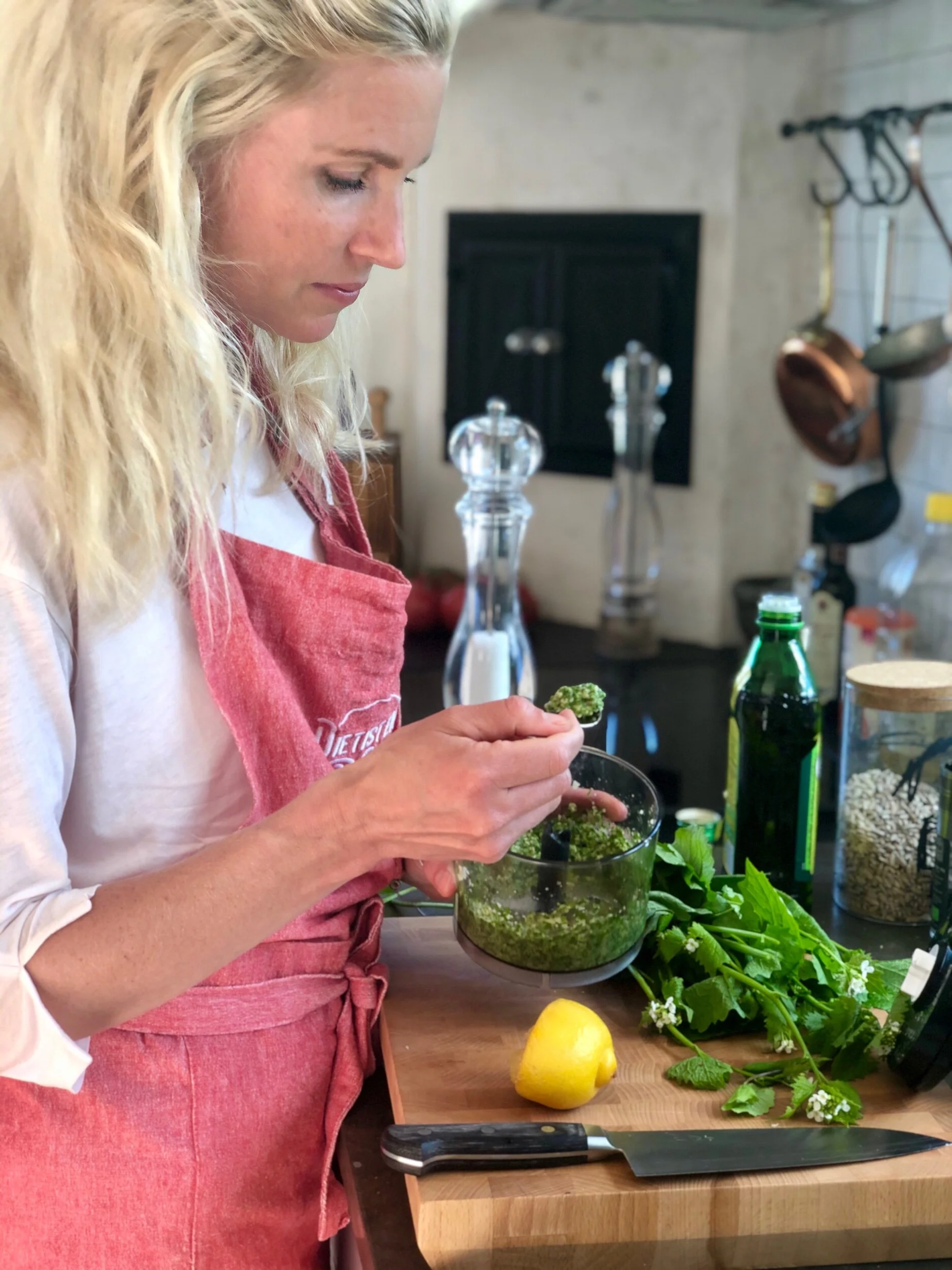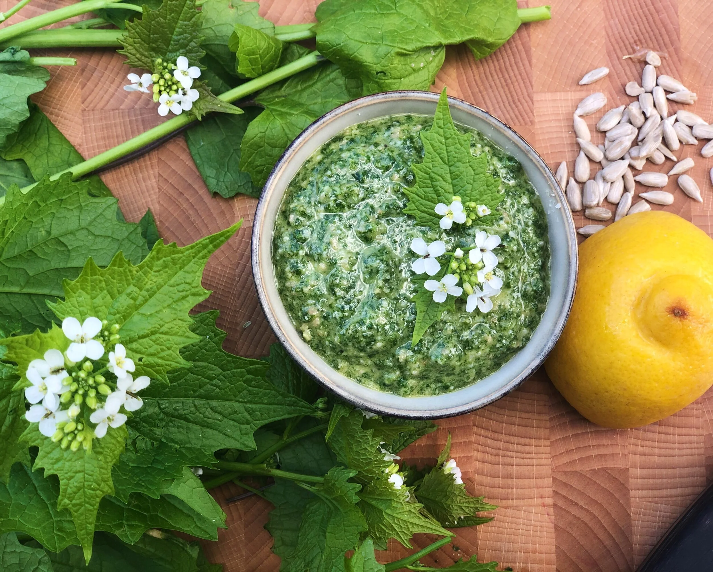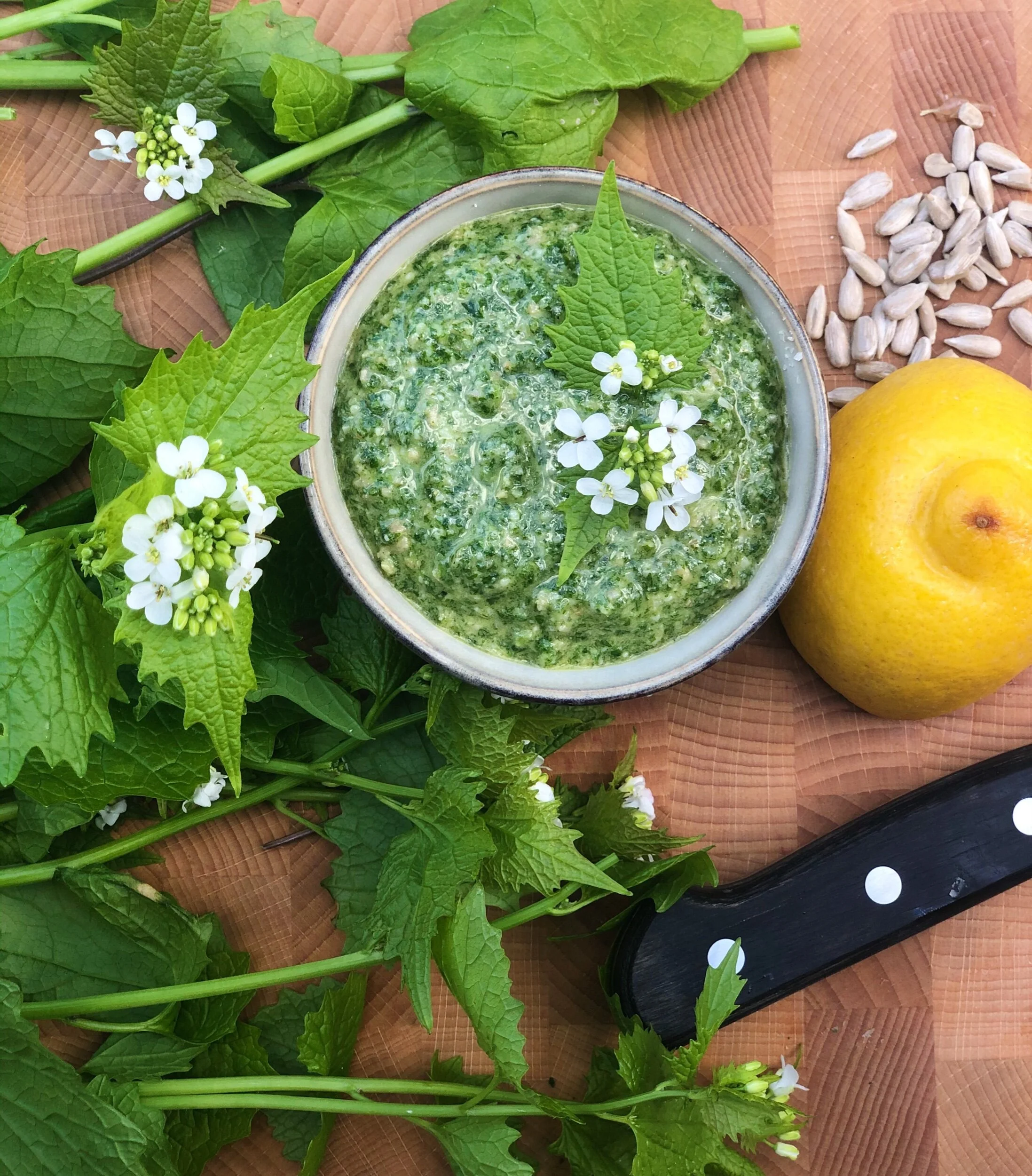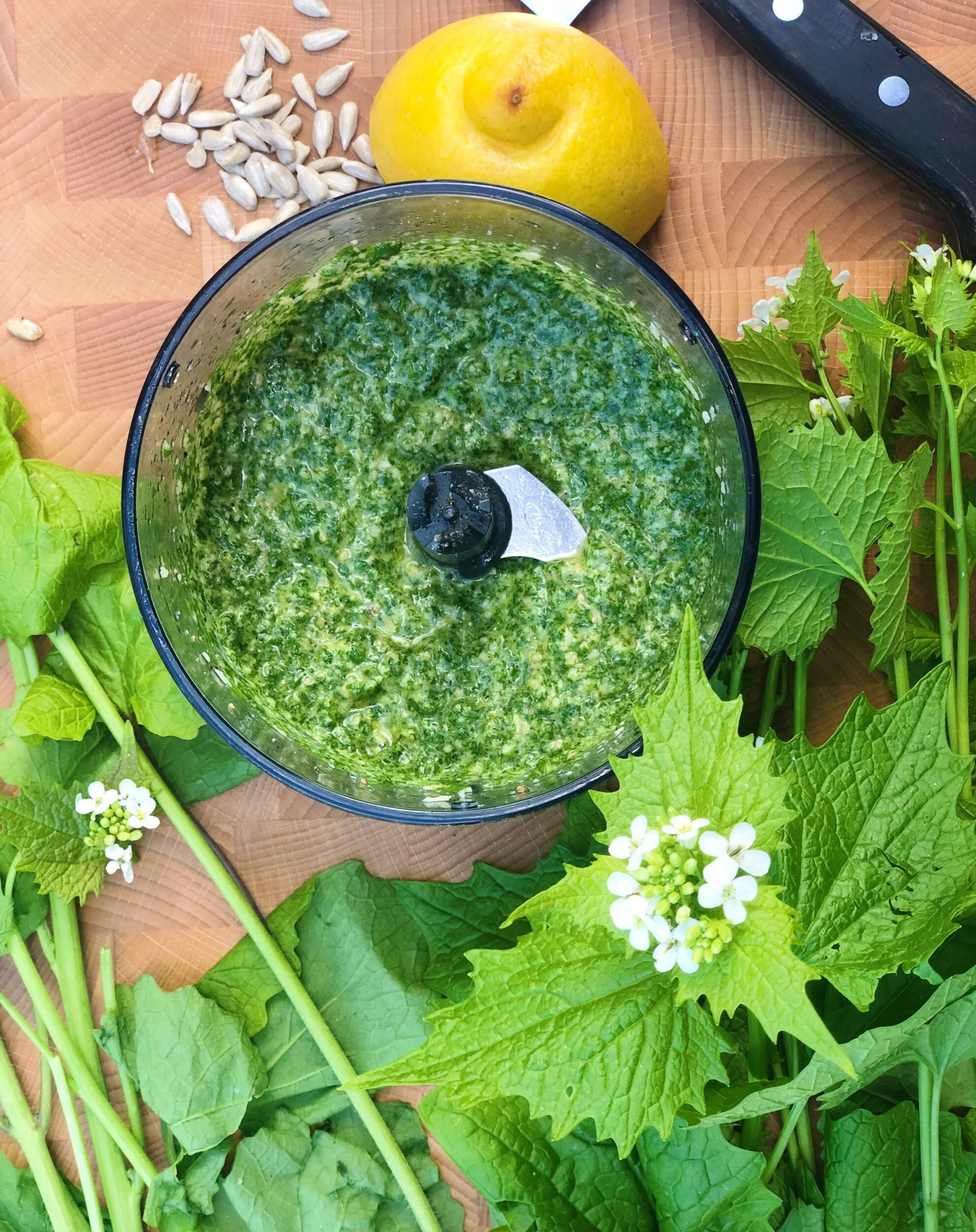 Skölj löktraven och krama ur vätskan. Mixa ihop med solrosfrön, ost och olja. Smaka av med salt och peppar. Späd eventuellt med lite mer olja.