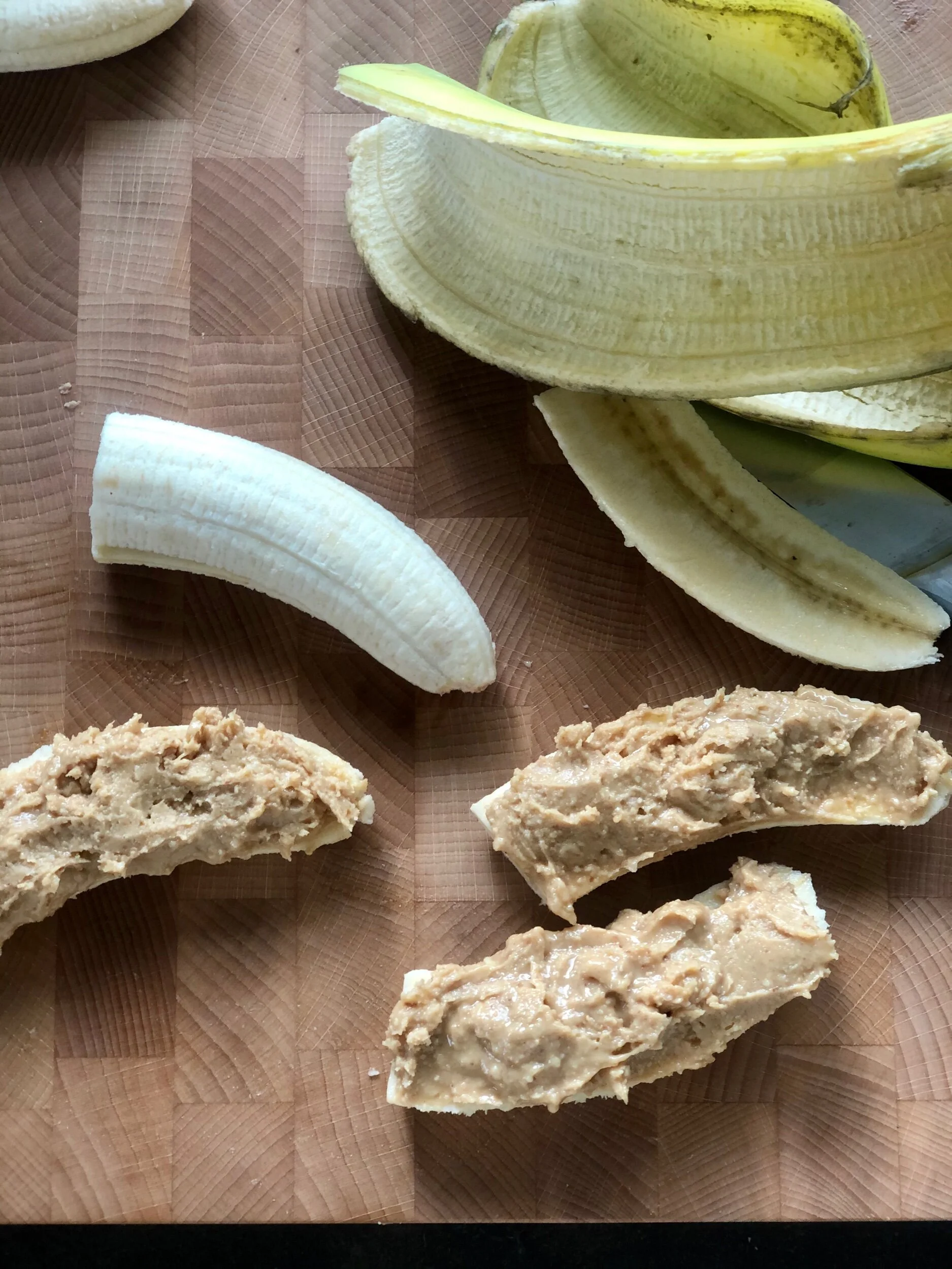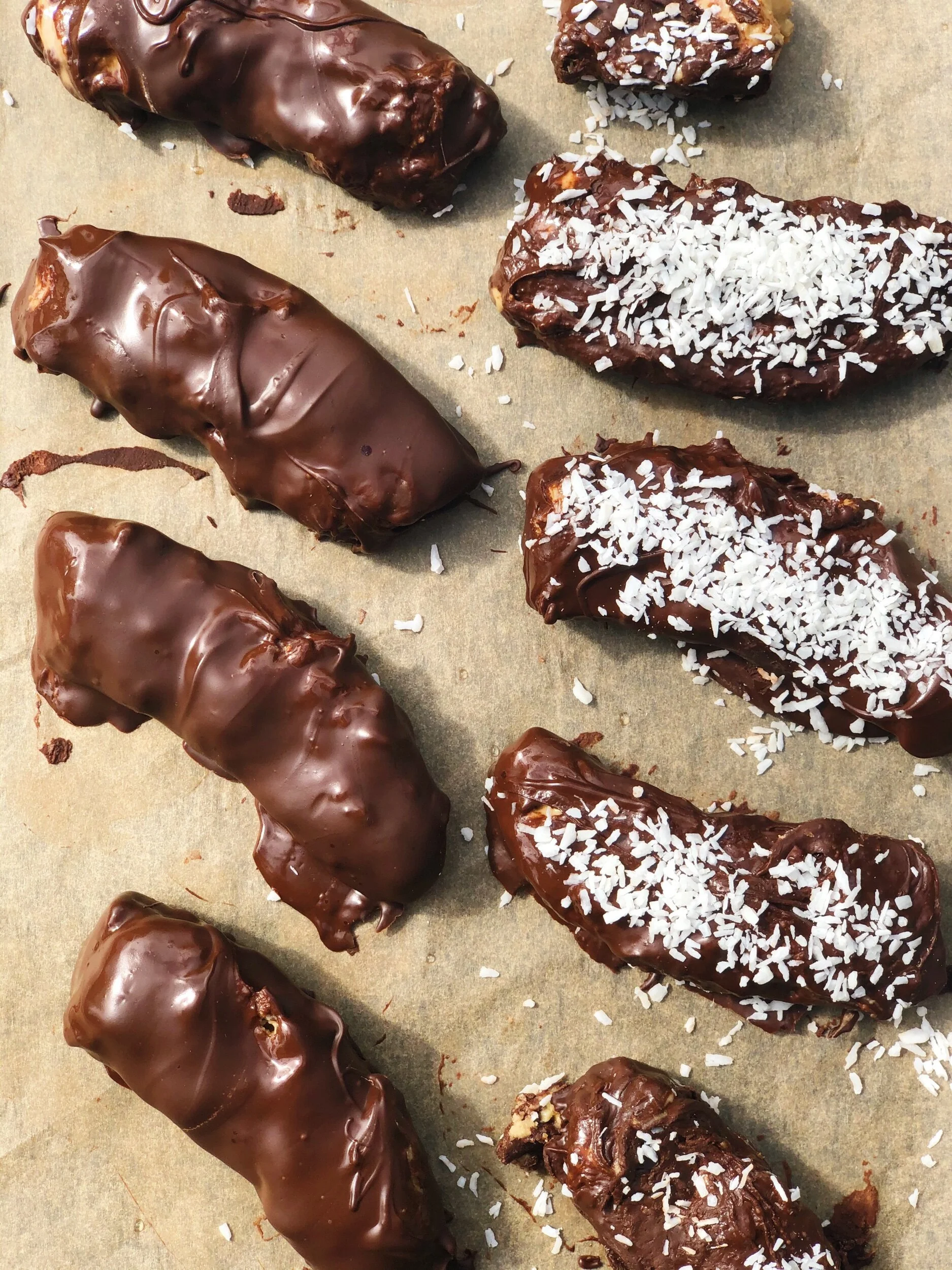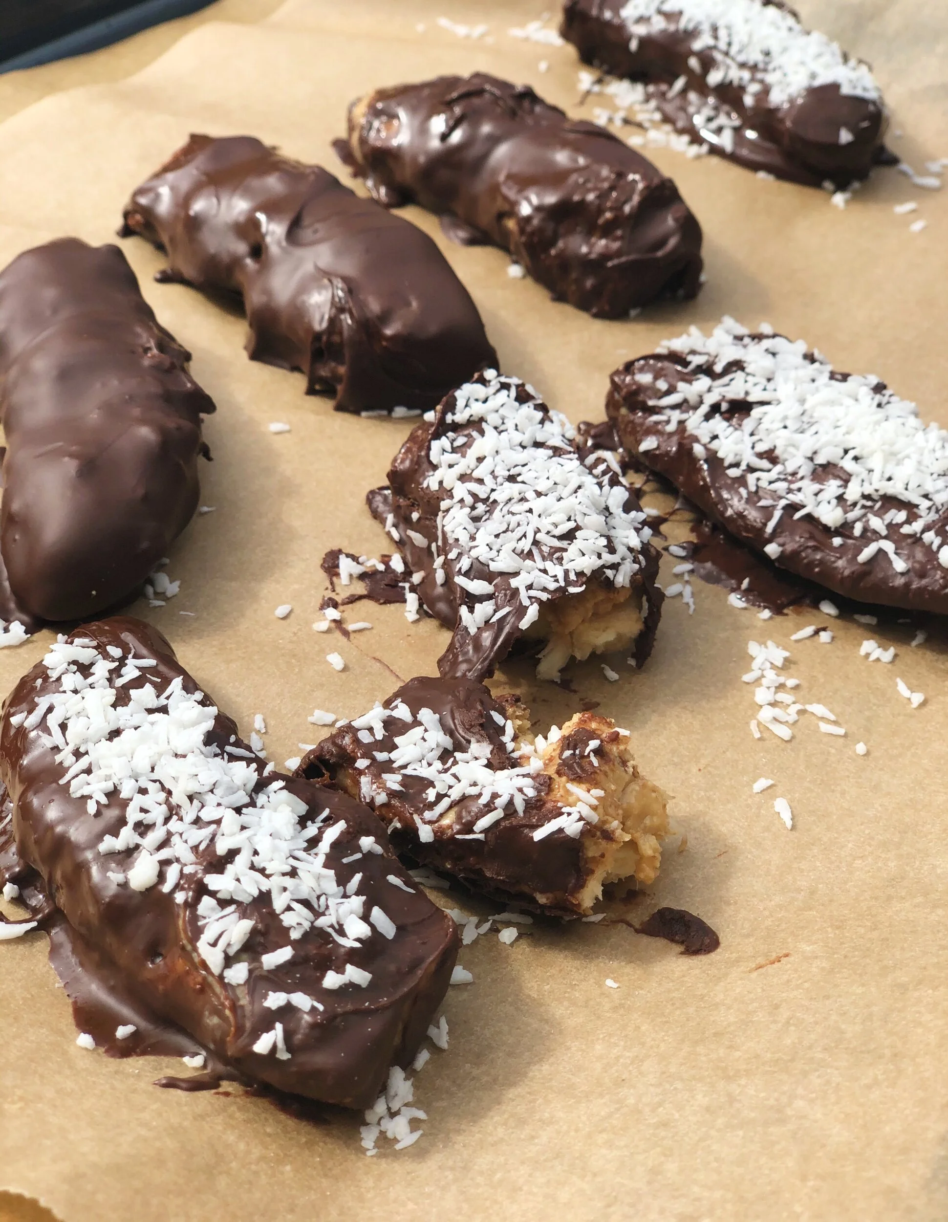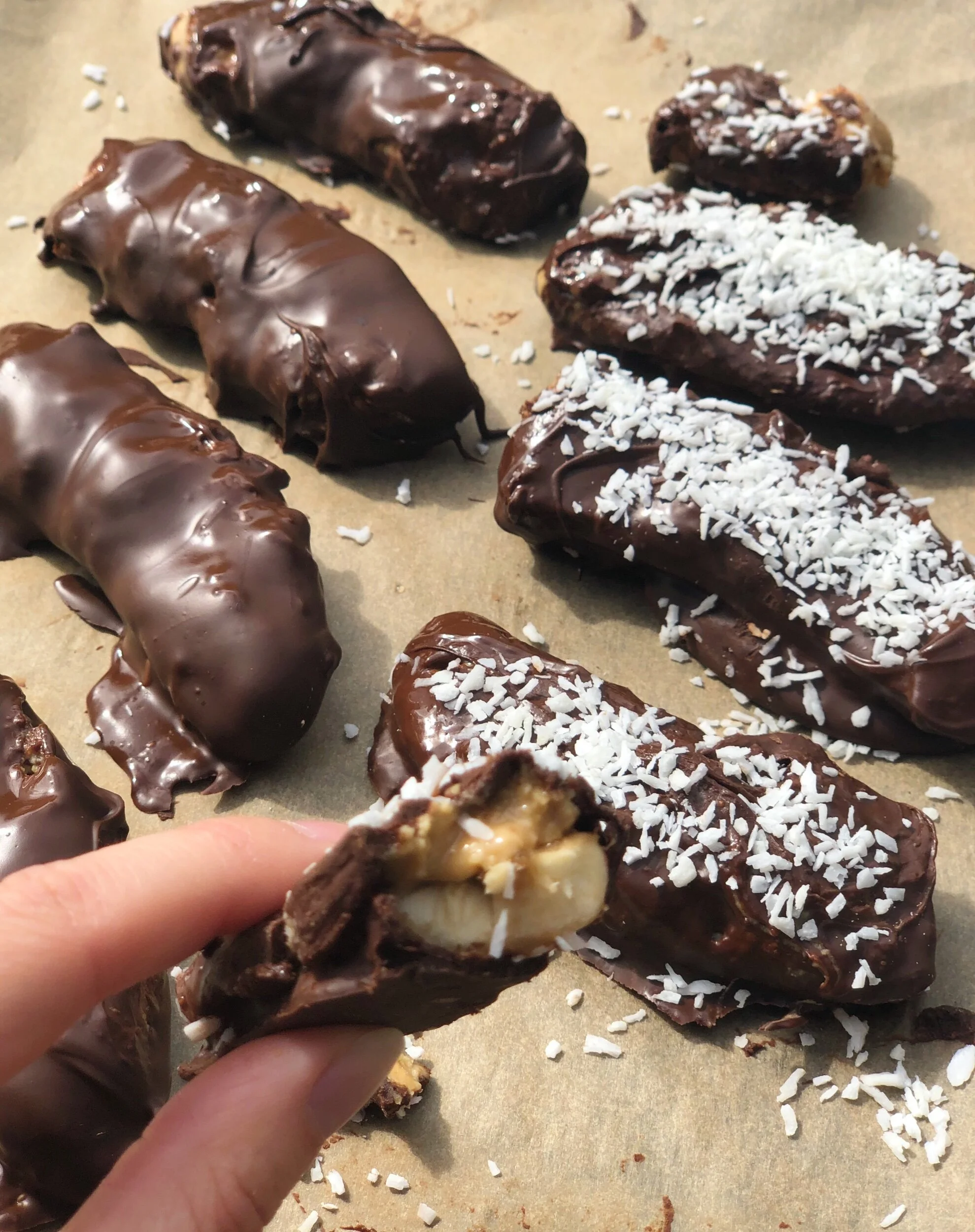 Skala bananerna och dela på mitten- och sen på längden. Bred jordnötssmöret längs med bananens platta (skurna) sida och ställ i frysen att stela ca 10 min. Smält chokladen försiktigt över ett vattenbad eller i micron. Doppa bananbitarna i chokladen och rulla runt. Lägg på ett bakplåtspapper, strö på kokos om du vill och låt stelna.