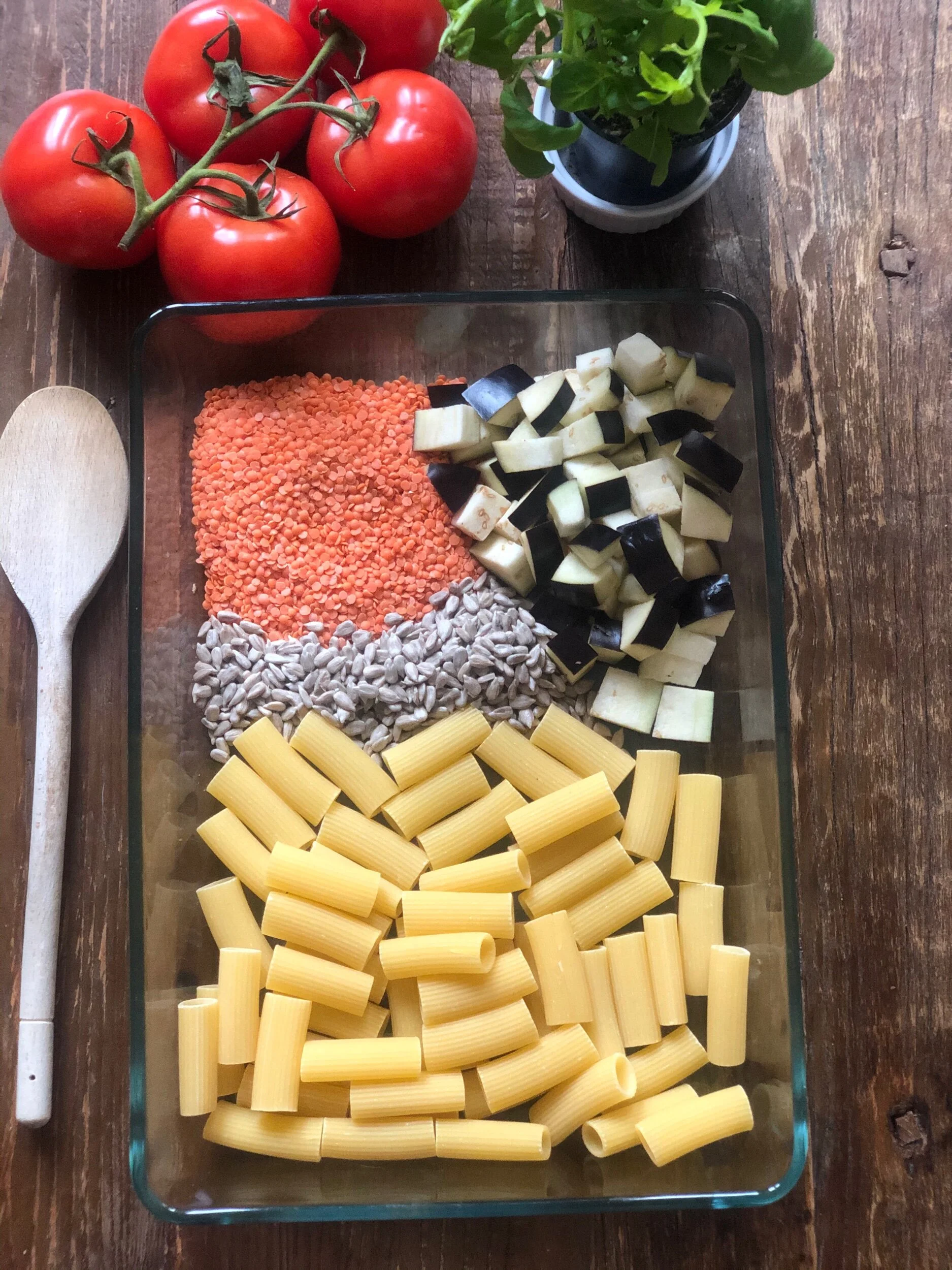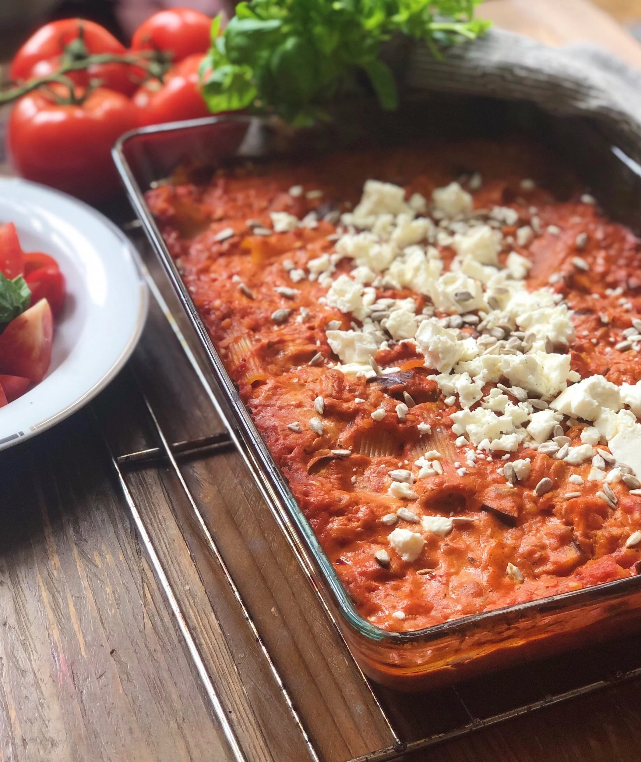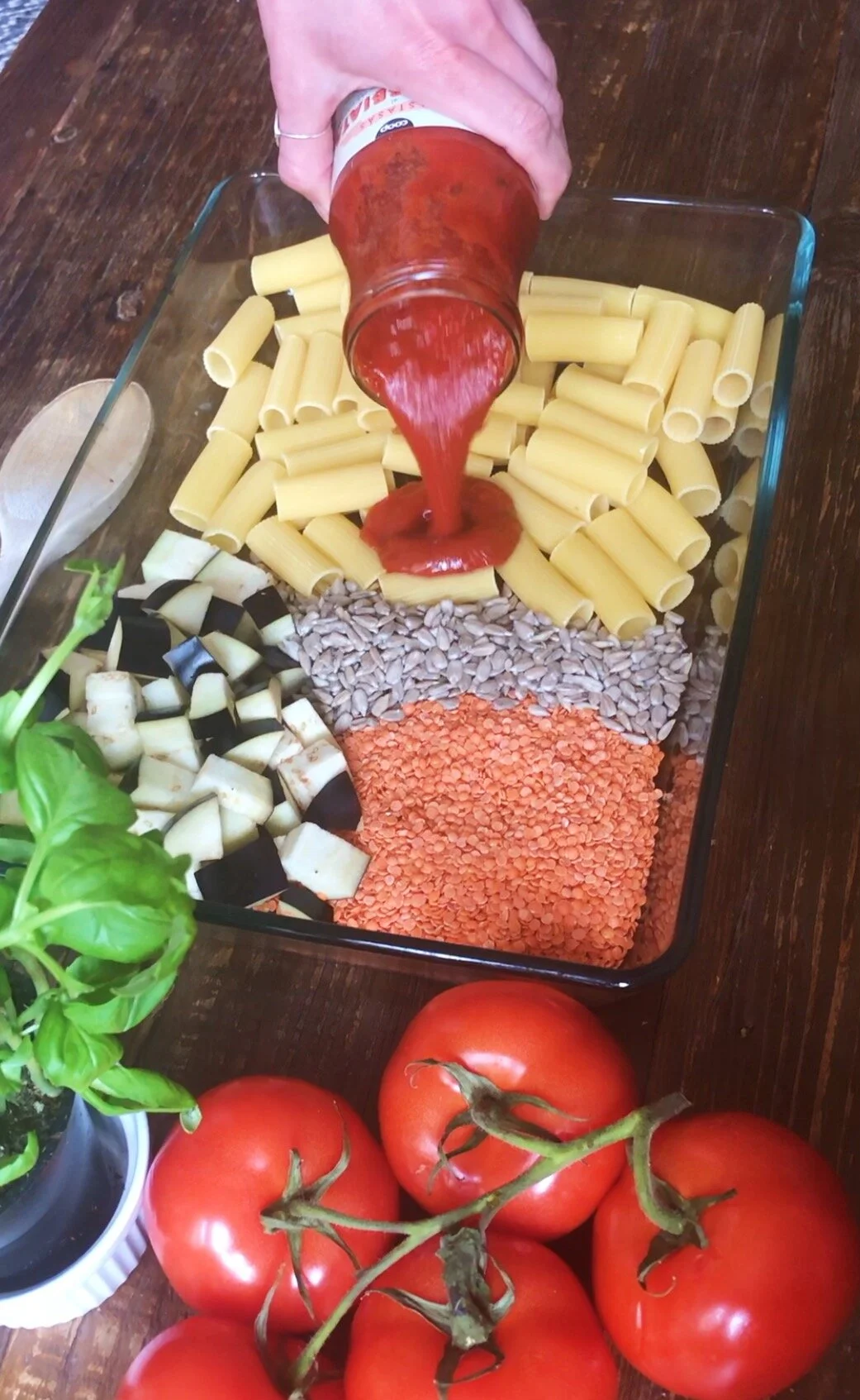 Sätt ugnen på 200 grader. Skölj och dela aubergine i sockerbitsstora bitar. Lägg aubergine i en ugnsform och häll på pasta, linser och solrosfrön. Blanda runt med tomatsås, créme fraiche och 1dl vatten. Ställ i ugn ca 25 min. Känn med en sticka så att pastan är lagom mjuk. Toppa om du vill med fetaost och klart!
