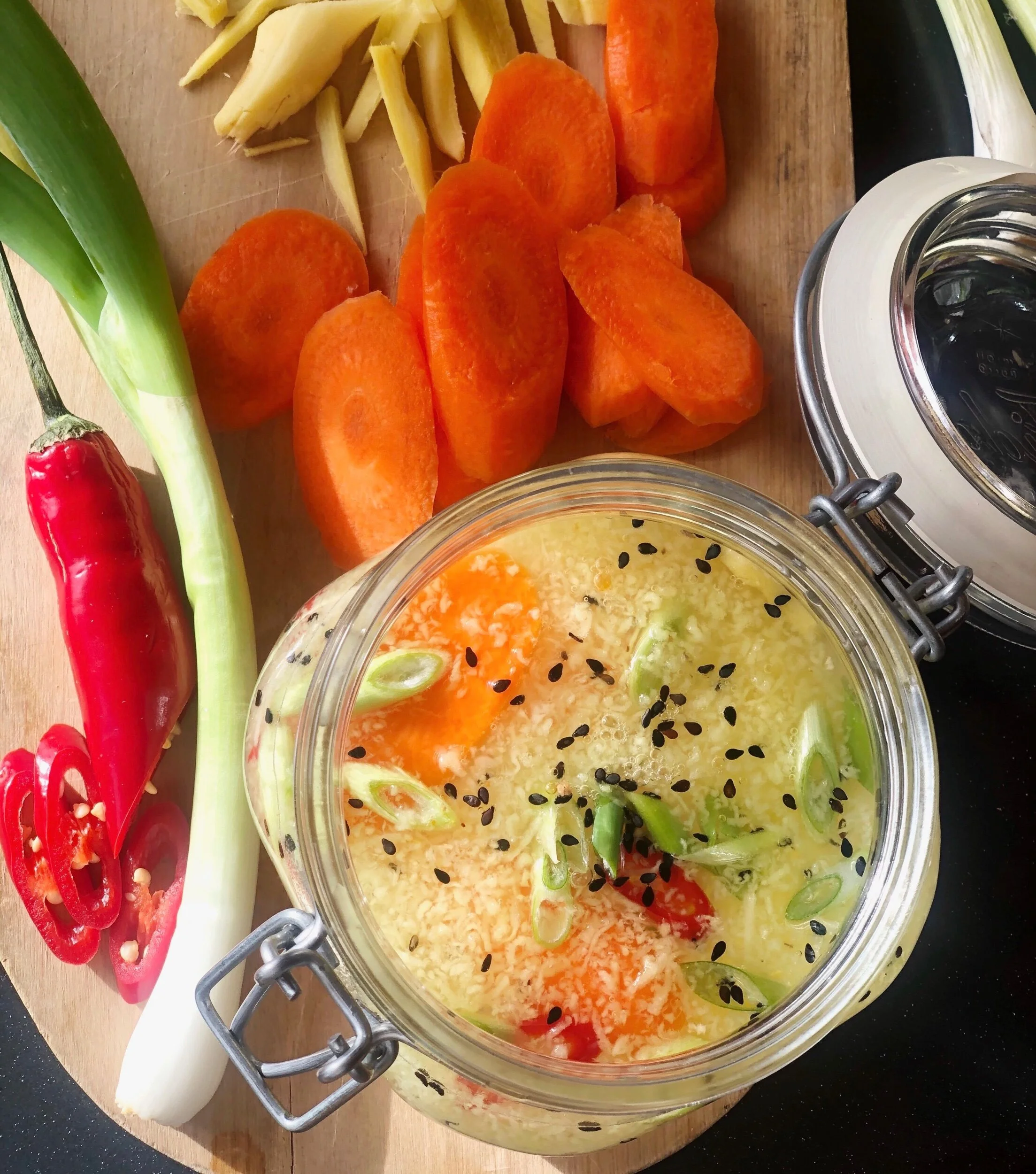 Blanda socker, ättiksprit och sesamolja med 2 dl vatten i en kastrull. Värm tills sockret smält och låt svalna. Skala ingefära och skär hälften i tändsticksstavar. Skala och skiva moroten i slantar samt strimla salladslök och chilin. Tillsätt ingefära, morot, salladslök och chili i lagen. Riv resten av ingefäran och pressa ner saften i lagen.