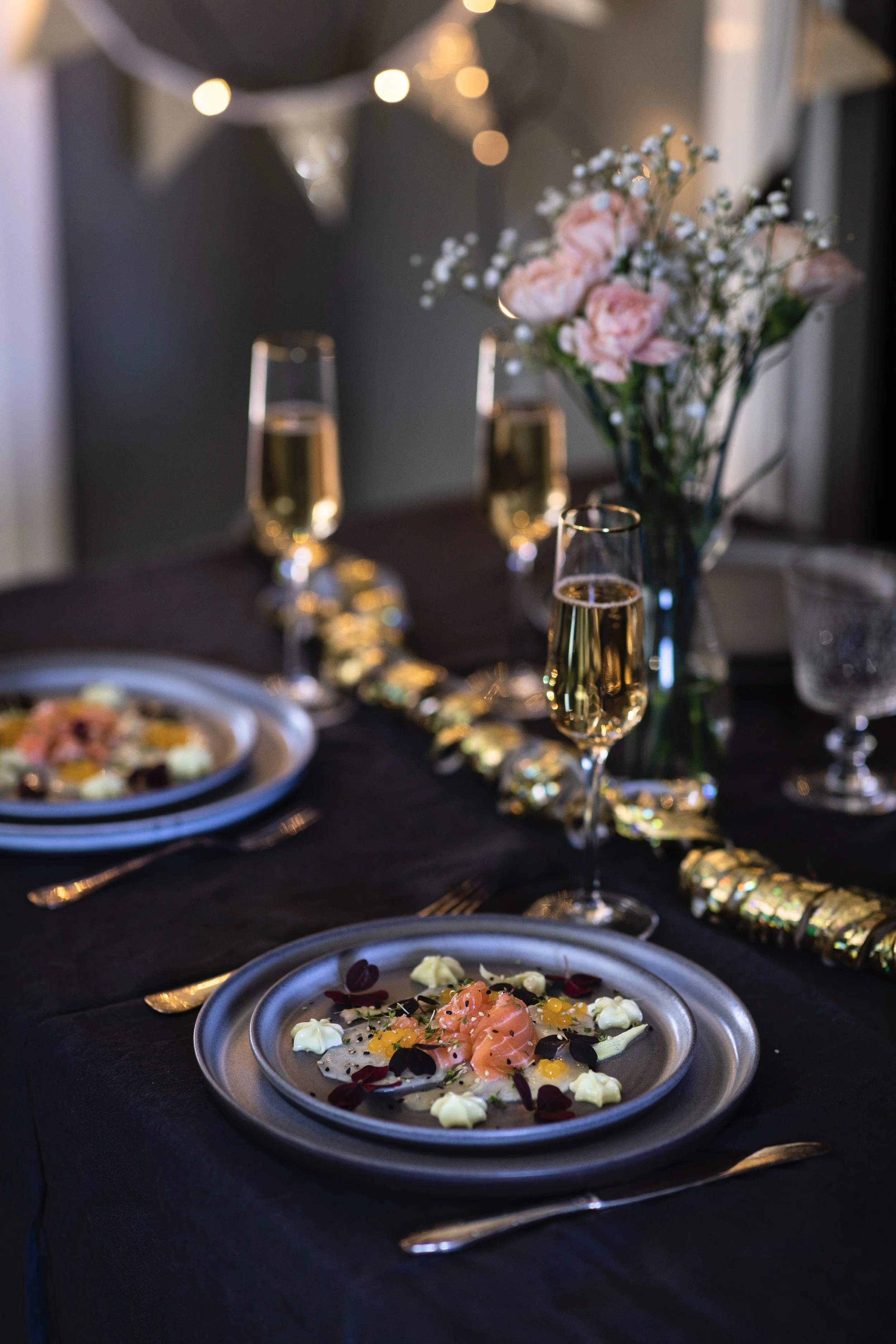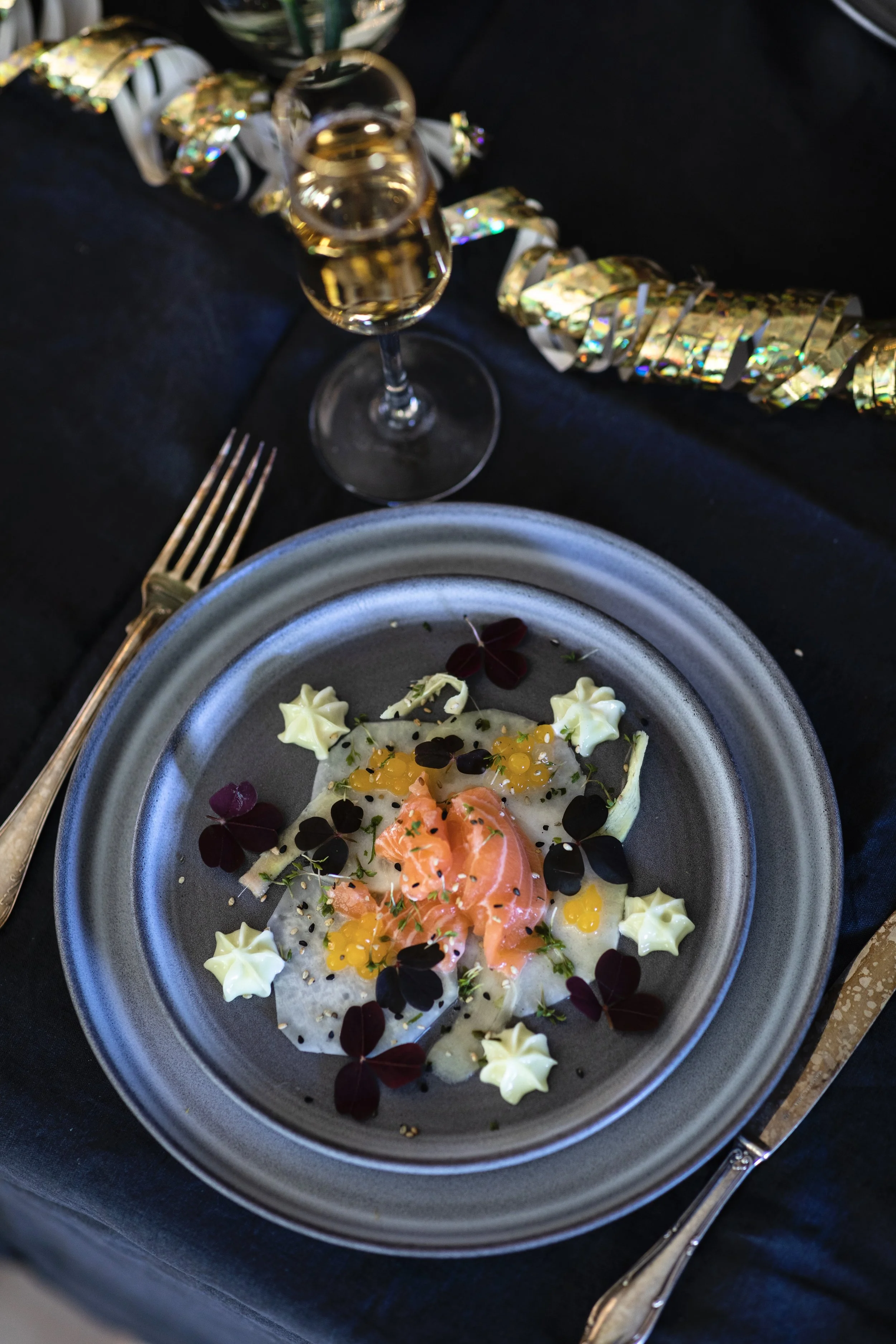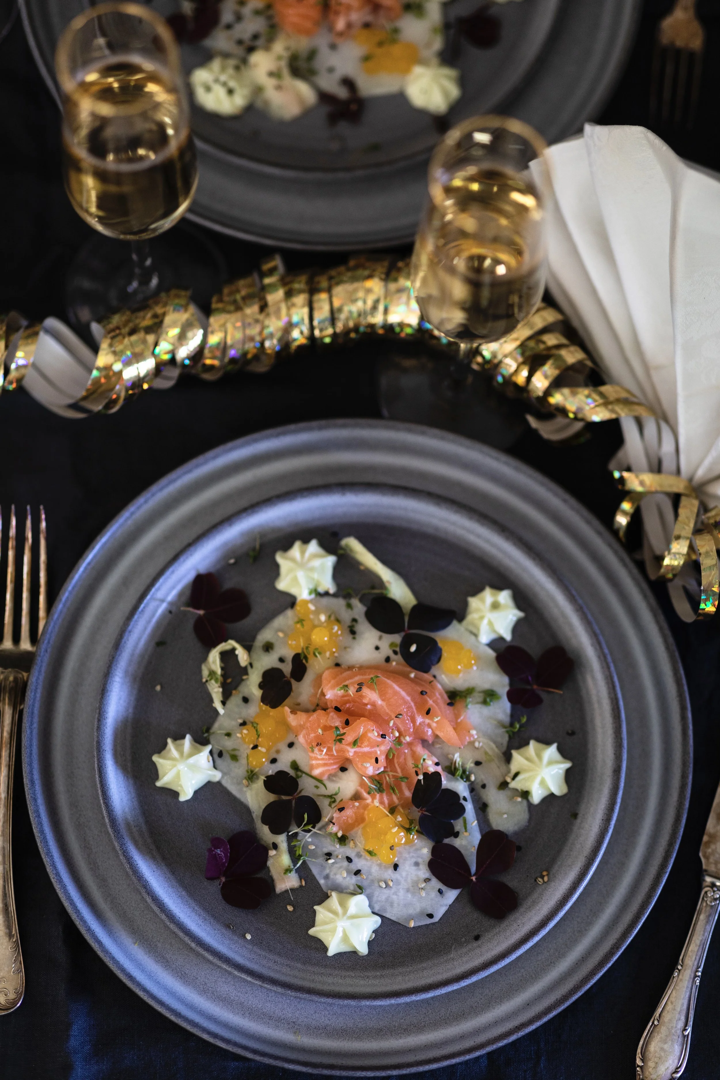 En vacker, enkel och lyxig förrätt som sätter tonen på nyårsmiddagen. Här i form av en sashimi ihop med svensk rotselleri, en fusion mellan Sverige och Japan, det bästa av två världar.