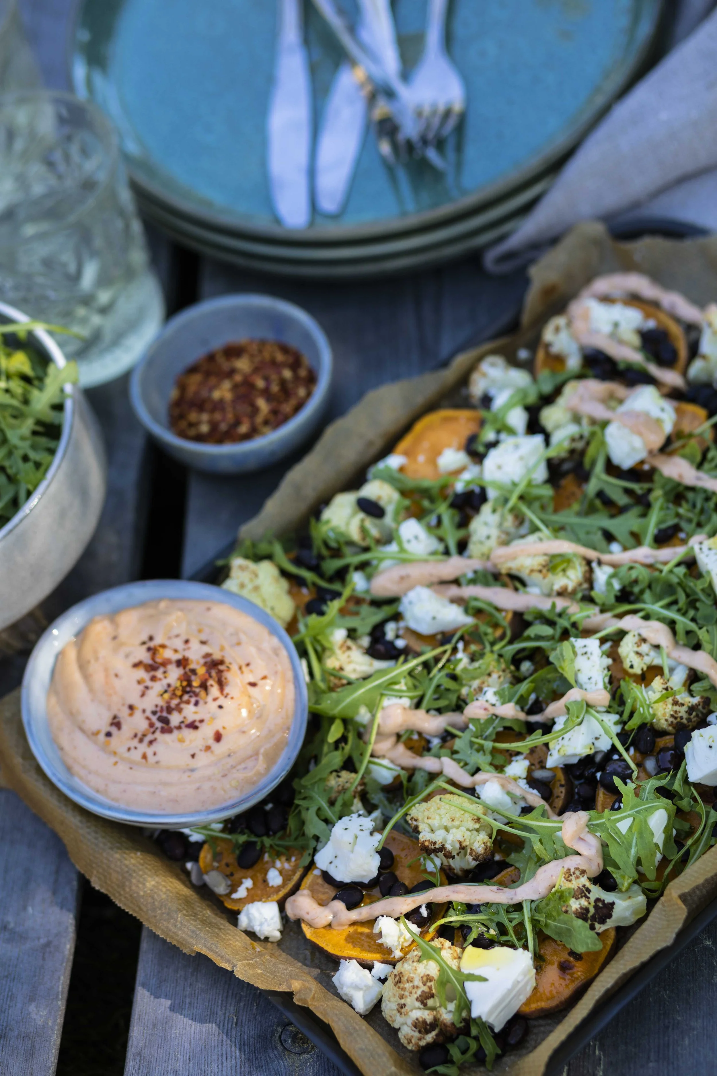 ROSTAD SÖTPOTATIS- OCH BLOMKÅLSPANNA MED CHIPOTLEMAJO