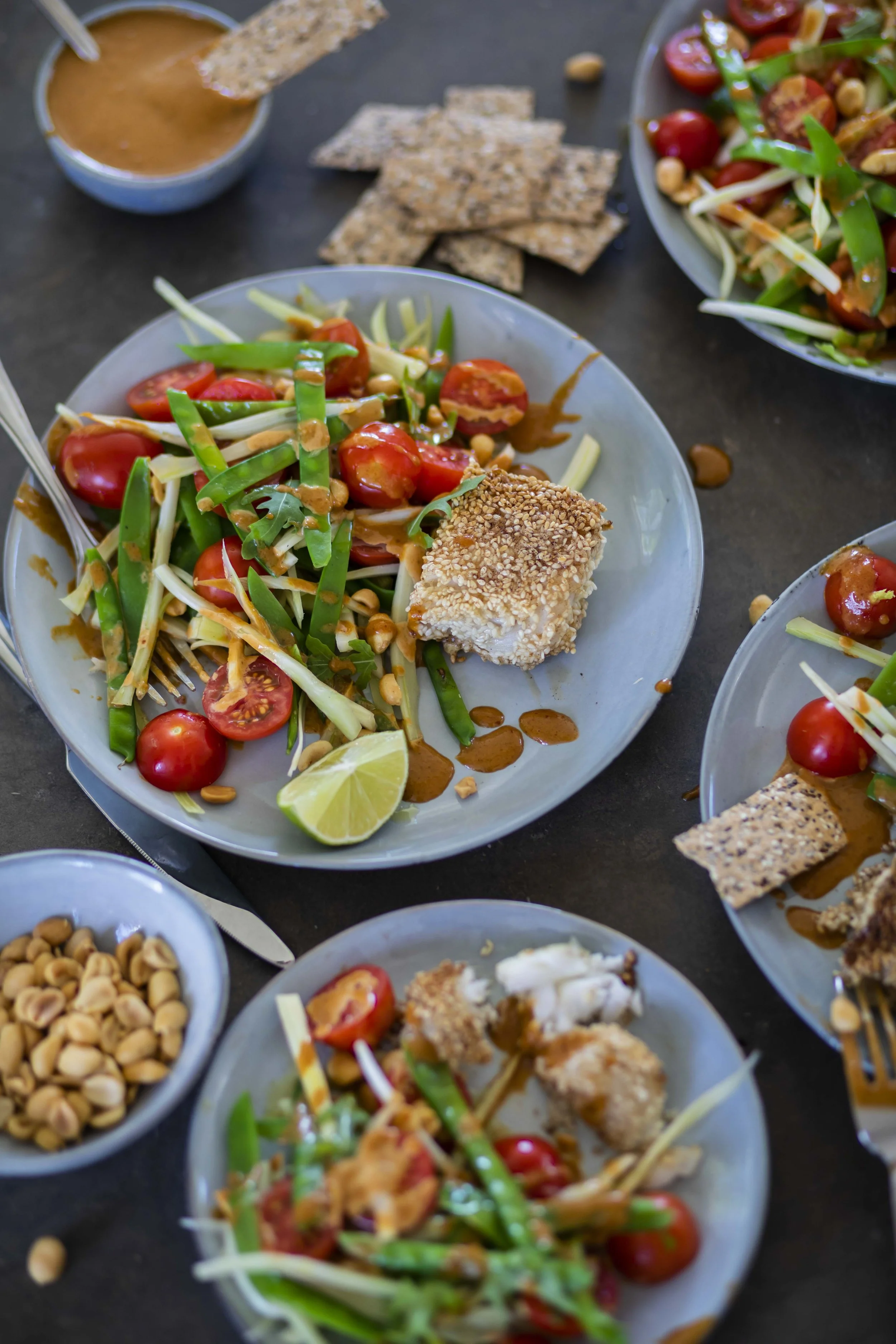 CHILI- & JORDNÖTSDRESSAD TOMAT & FÄNKÅLSSALLAD MED KRISPIG TORSK
