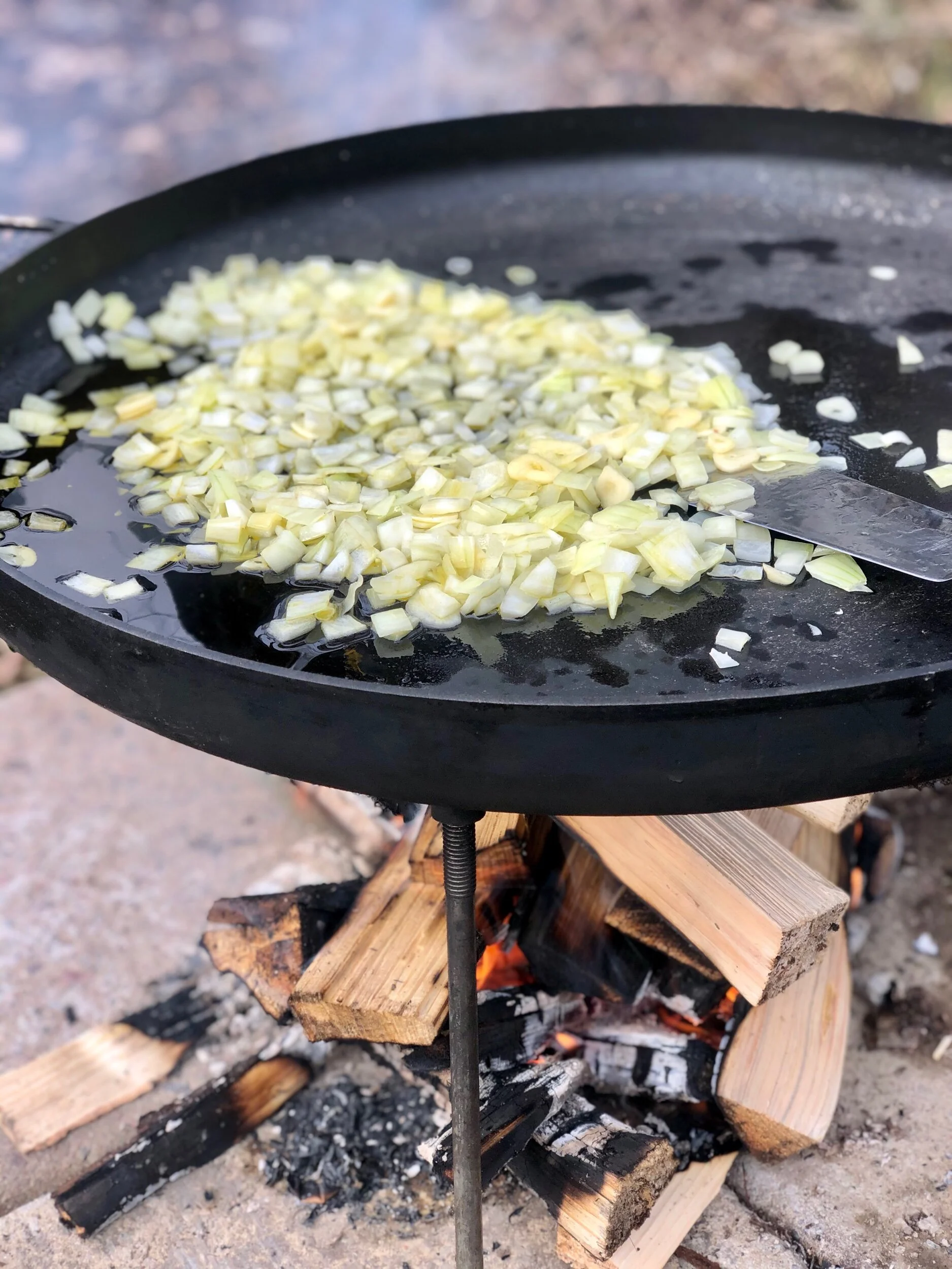 2. Värm olja i på en stekhäll, utekök eller i stekpannan inne och fräs löken utan att de tar färg några minuter. Tillsätt saffran, paprika pulver och chiliflakes den sista minuten.