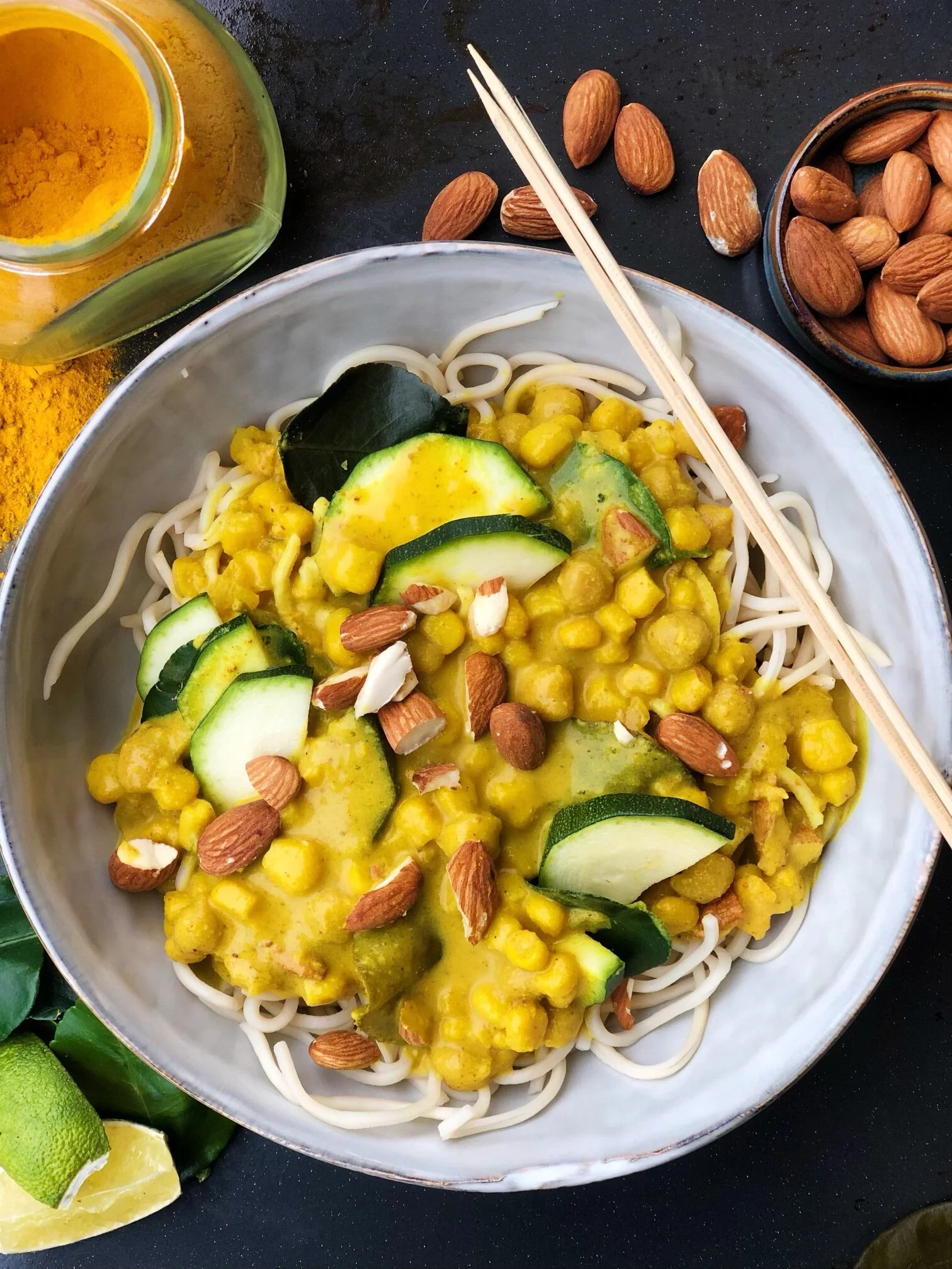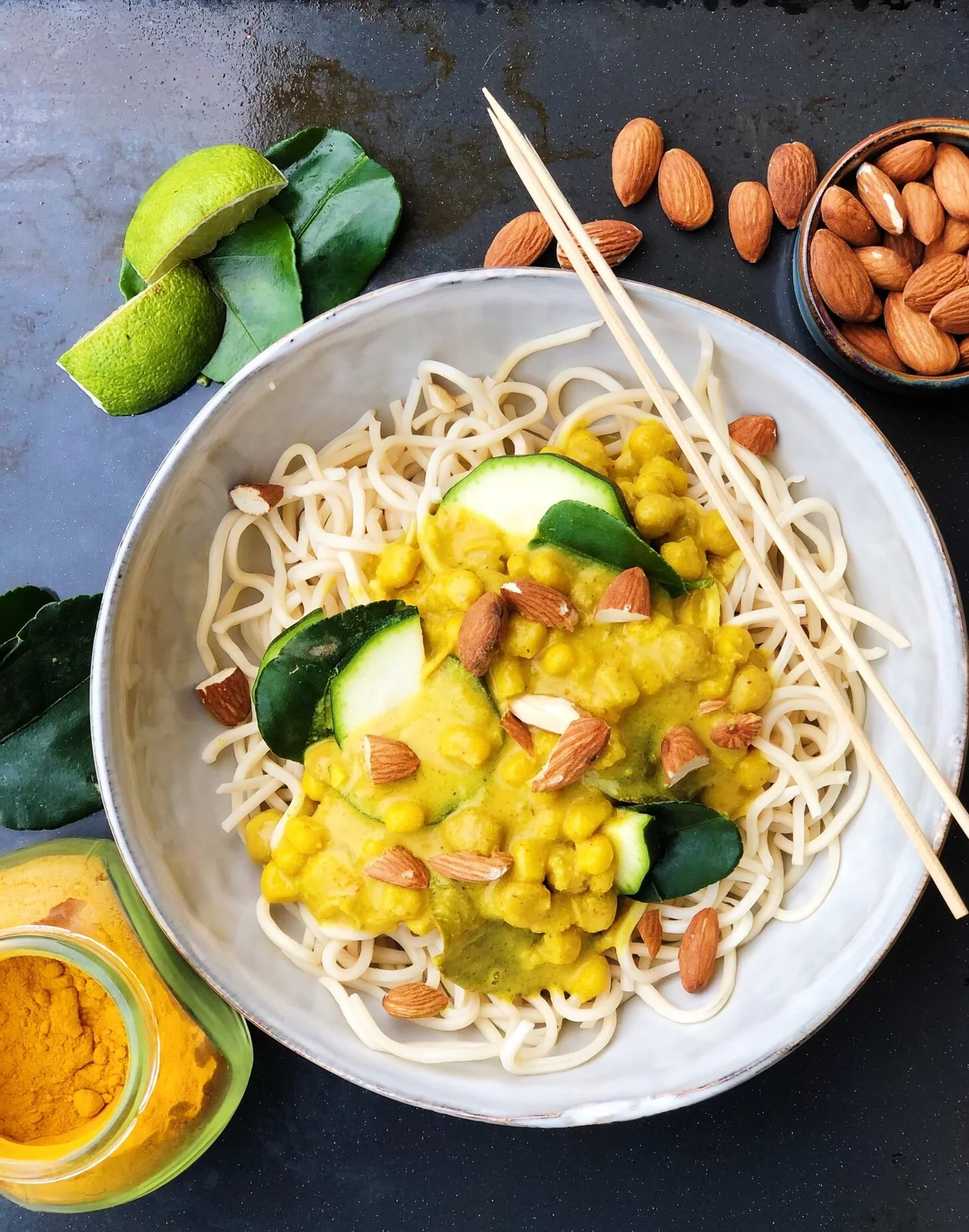 Blanda ner nudlarna i grytan och rör om. Häll upp i fyra skålar och toppa med rostad mandel. Servera gärna med en klyfta lime.