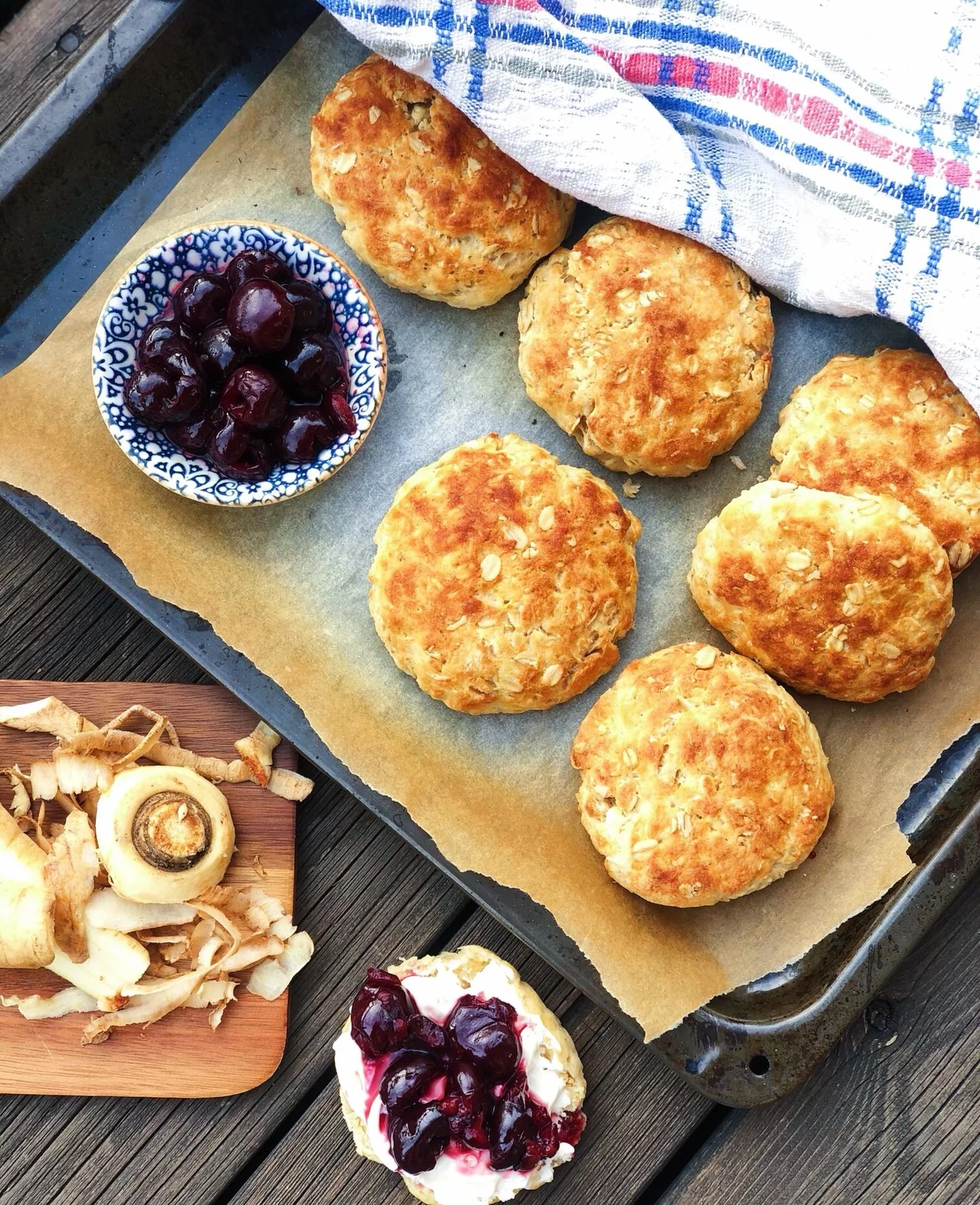 Vi äter gärna nygräddade scones med färskost och mosade körsbär!