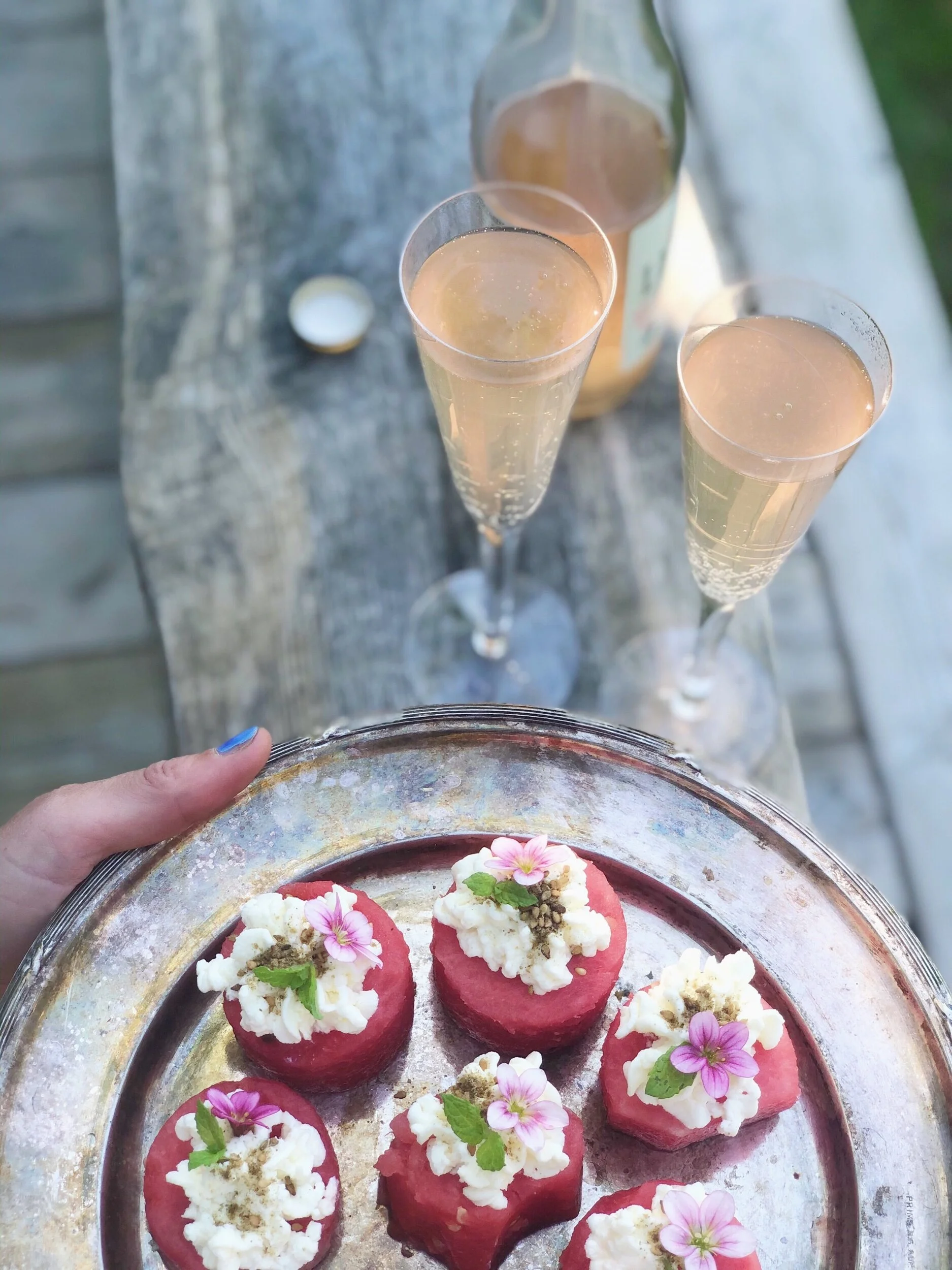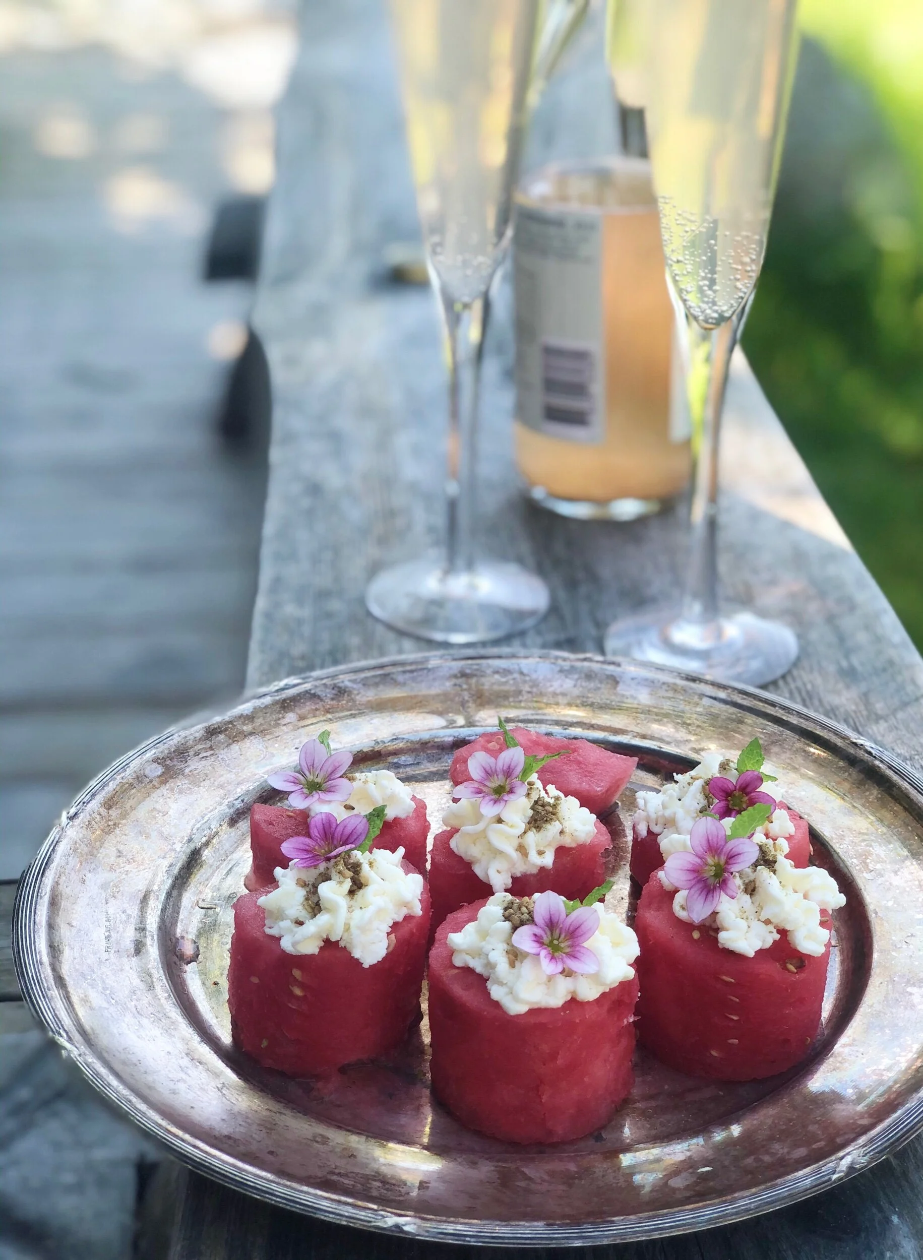 Toppa melonbitarna med fetaröran. Ett tips är att spritsa röran för festligare känsla!
