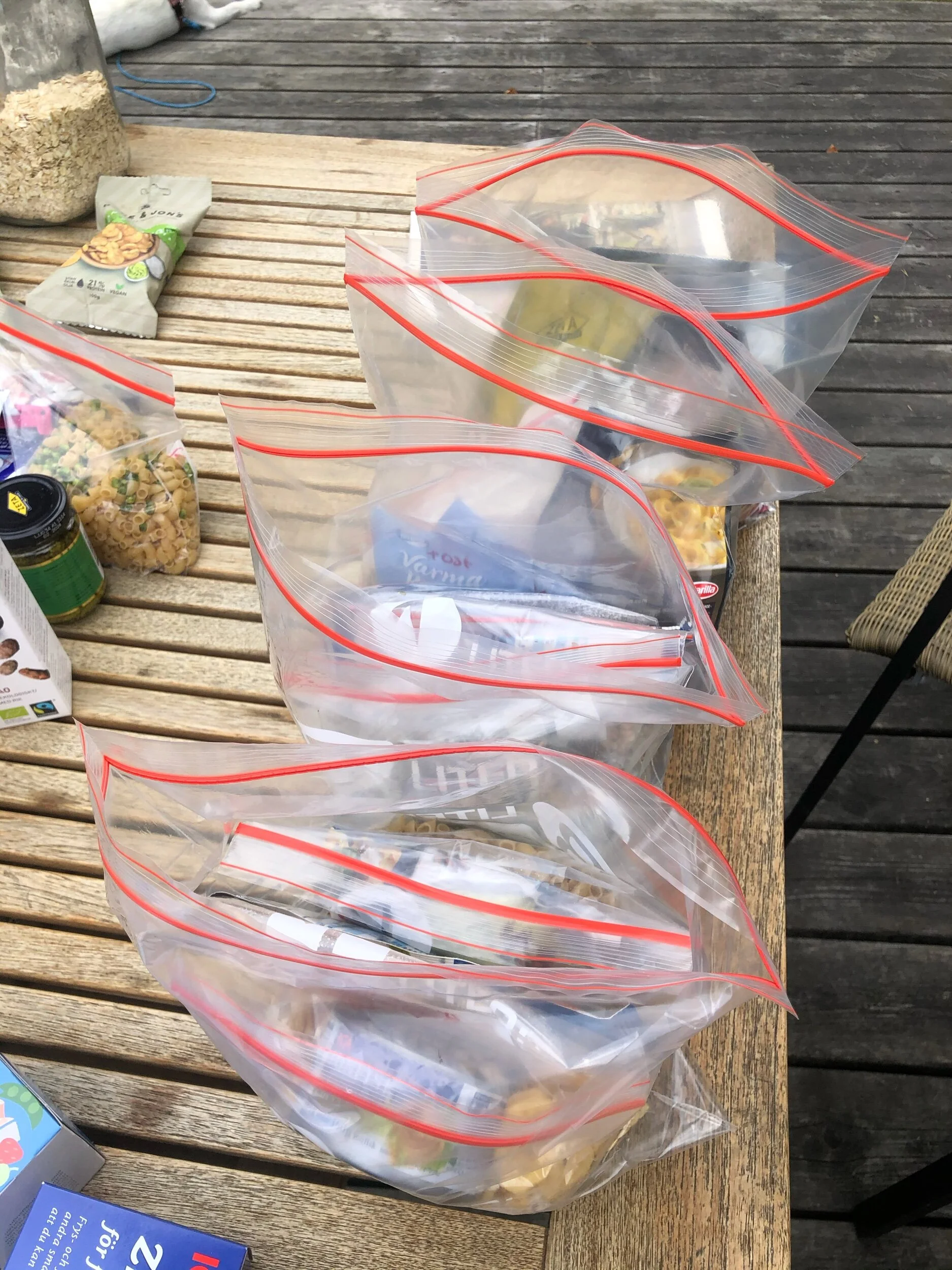 Måtta upp ingredienserna för de rätter du ska ta med och blanda färdigt i zip-påsar och skriv på vad det är i och gärna när det ska ätas också.